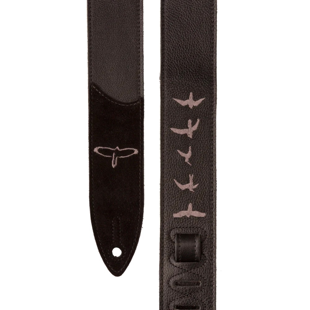 バード・インレイ・デザインの刺繍が施され、高級感のあるプレミアム・ブラック・レザー・ストラップ。エレキ・ギターからアコースティック・ギターまでモデルを問わず、すべてのPRSモデルのストラップ・ピンに対応するよう特別に設計されたピンホールを備えています。 Width: 2"