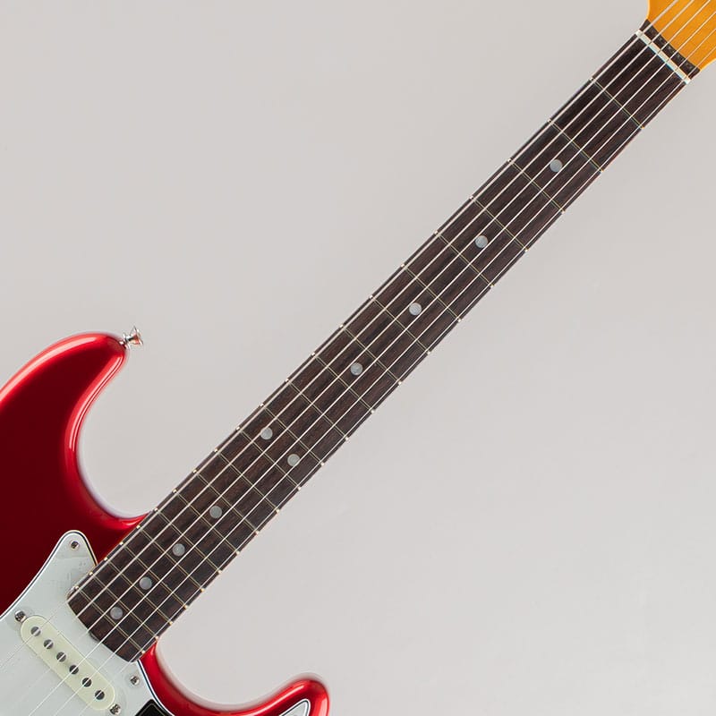 1965 Stratocasterは、1965 “C”シェイプメイプルネックに、大きめのパールドットインレイを採用したラウンドラミネイトローズウッド指板を備えているのが最大の特徴です。その他、11ホールの3-plyホワイトピックガード、大きめのレタリングを採用したトランジションロゴ、”グレーボトム” Pure Vintage 1965ピックアップセットなどのオーセンティックな特徴を備えています。