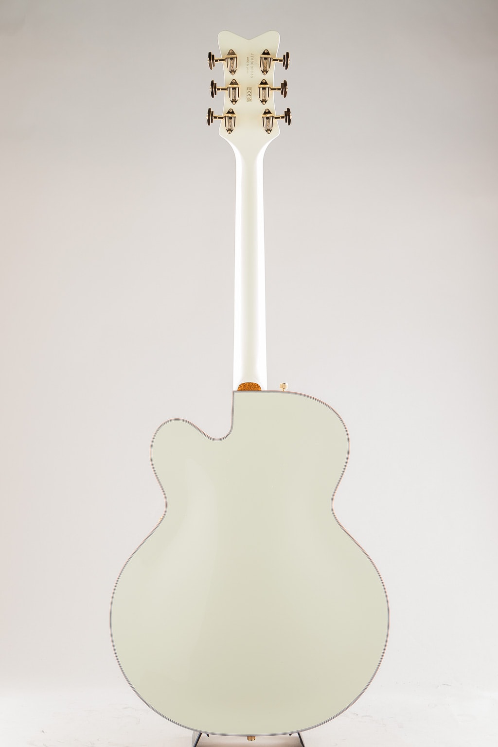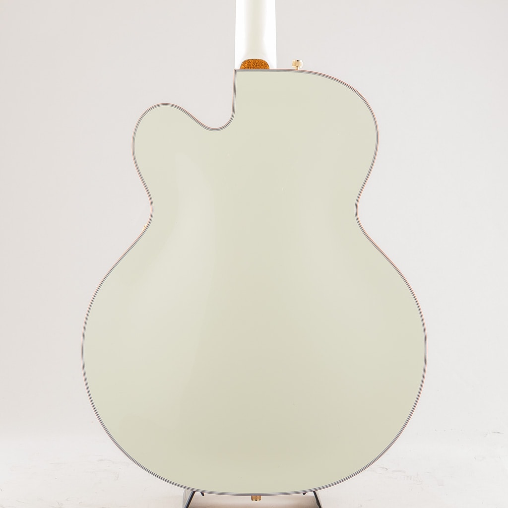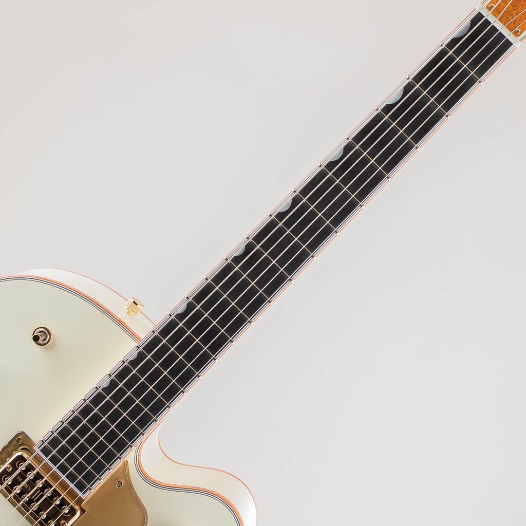 傑作と評されるオリジナルをより洗練させた、G6136T-59Vintage Select Edition '59Falcon Hollow Body with Bigsbyは、エレクトリック・ギターの黄金時代から続く正確な機能と、仕様的な取り決めを忠実に組み合わせたモデルです。 輝かしい音色と外観で耳と目を満足させるこの“珍しい鳥”は、プレイヤーが手にすることで命を宿し、あらゆるギターのストロークに応じで独特の声で歌います。 TV Jones Classic PUのペアは、強力なトーンと比類なきダイナミクスを生み出します。 グレッチの新しい“Squeezebox”ペーパーイン・オイルコンデンサーは、信じられないほどに洗練された高音域を提供します。 固定されたSpace Controlブリッジとボーンナットを組み合わせが、完璧なチューニングの安定性を実現。Bigsby B6GVTビブラートテールピースが、演奏に表現力豊かなきらめきを加えます。 1959年スタイルのトレッスル・ブレイシング、マルチプライのラミネート・メイプルバック&サイドと、響きの良い3プライ・メイプルトップのボディは、音に“大砲”のような驚くべき射影力を与え、豊かでバランスが取れたトーンを発射します。 滑らかな演奏性を実現するために、快適で汎用性の高い標準的な“U“字型プロファイルのメイプルネックを採用。22個のミディアム・ジャンボフレットを装備したラジアス12インチ(304.8ミリ)のエボニー指板と、クラシックなグレッチのサムネイル・インレイを採用し、複雑なコードや幅の大きいベンディング、複雑なシングルノートも楽に演奏できます。 とても象徴的かつ印象的なこのギターは、ゴールドのジュエルドGアロー・コントロールノブを使用。ボディ、ネック、Fホールにゴールドのスパークルバインディングを施すなど、とゴールドハードウェアを採用しています。ヴィンテージ・ホワイトグロスのニトロ・セルロースラッカー・フィニッシュを使用し、グレッチロゴが入ったゴールドの厚いヴィンテージ・プレキシピックガードを備えます。 見事なルックスと巨大なサウンドを備え、実に象徴的なG6136T-59 Vintage Select Edition '59Falcon Hollow Body with Bigsbyは、グレッチギターの“最高峰”です。 デラックス・ハードシェルケースが付属されます。