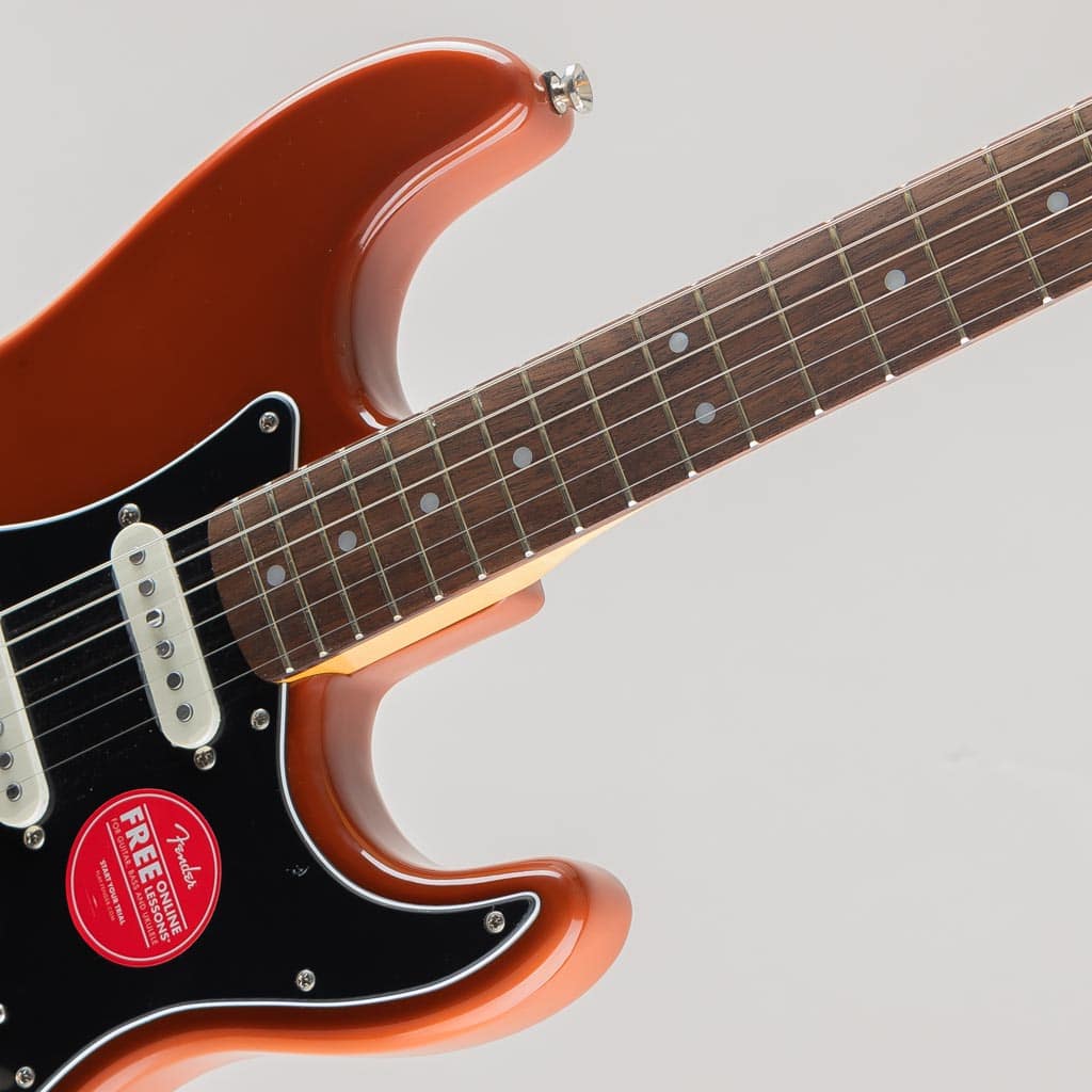 このSquierのレトロモデルは、当時のスタイルを反映したヘッドストックデカール、重厚なニッケルメッキハードウェア、そしてクラシックな雰囲気を醸し出すヴィンテージティント仕上げのグロスネックも特徴です。
