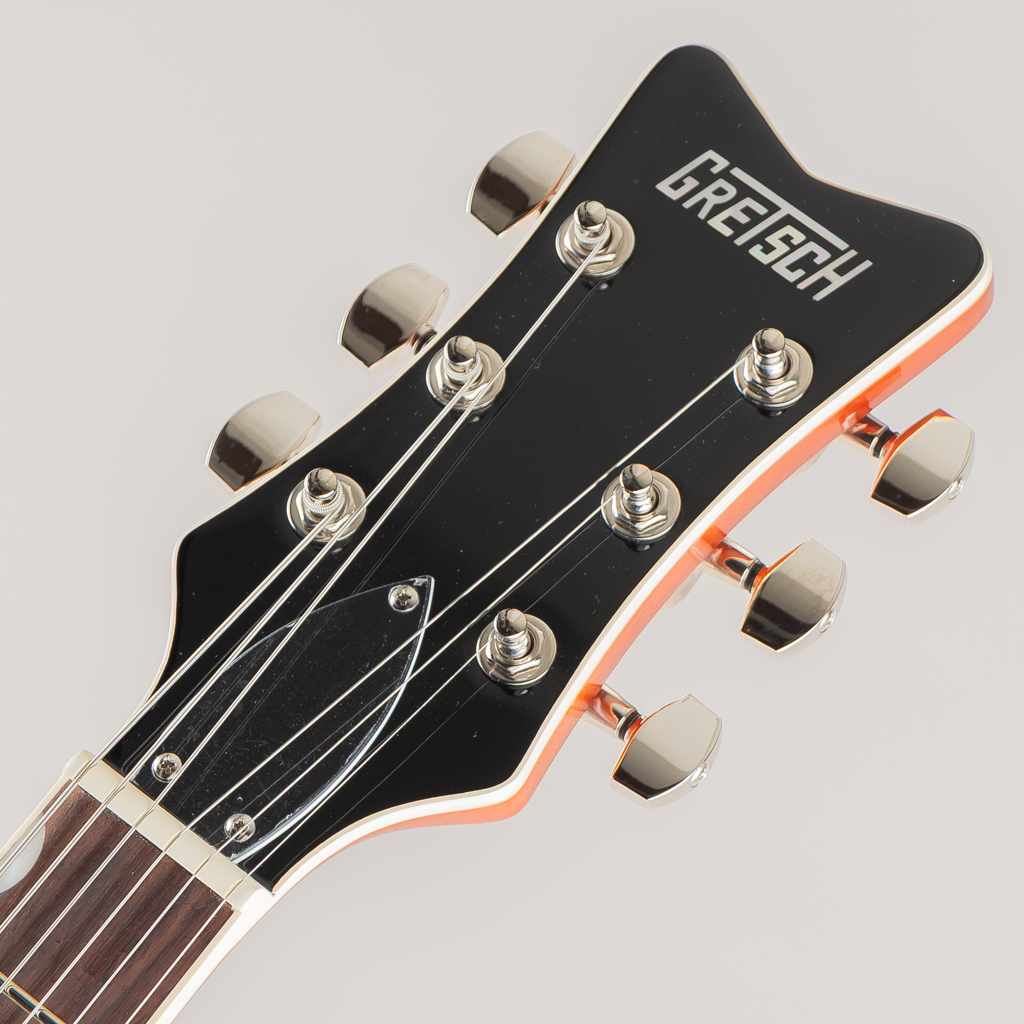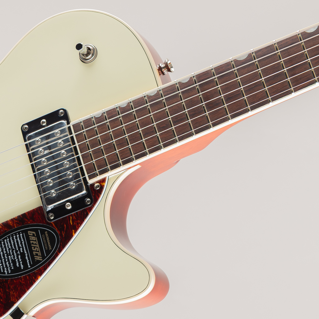 ネックはバランスの取れた丸みのある"C"ネックシェイプで、テーパードショルダーデザインを採用することですべてのプレイヤーに快適な演奏経験をもたらします。適度な質量感が、全ポジションでの正確な演奏性を実現します。また、ネックに採用されているマホガニー材は力強く豊かなトーンを実現するのに理想的なサウンドキャラクターを備えています。指板は、トーンと演奏性を決定づける非常に重要なパーツです。Electromatic Jetは、のエイジドホワイトバインディングが施された本物の1-plyローズウッド指板を採用しており、滑らかでシルキーな弾き心地と、温かみのあるウッディなトーンを生み出します。