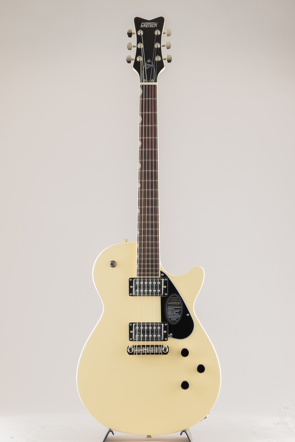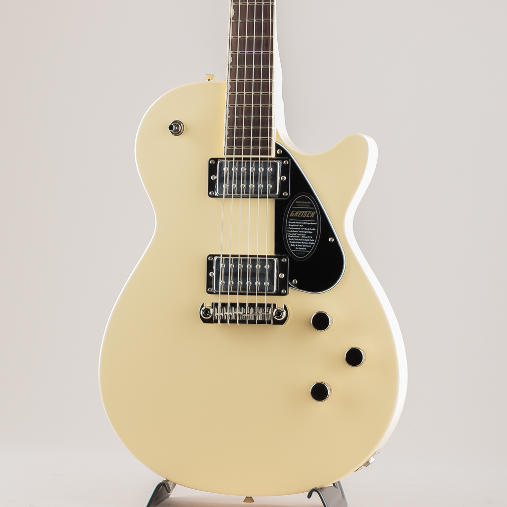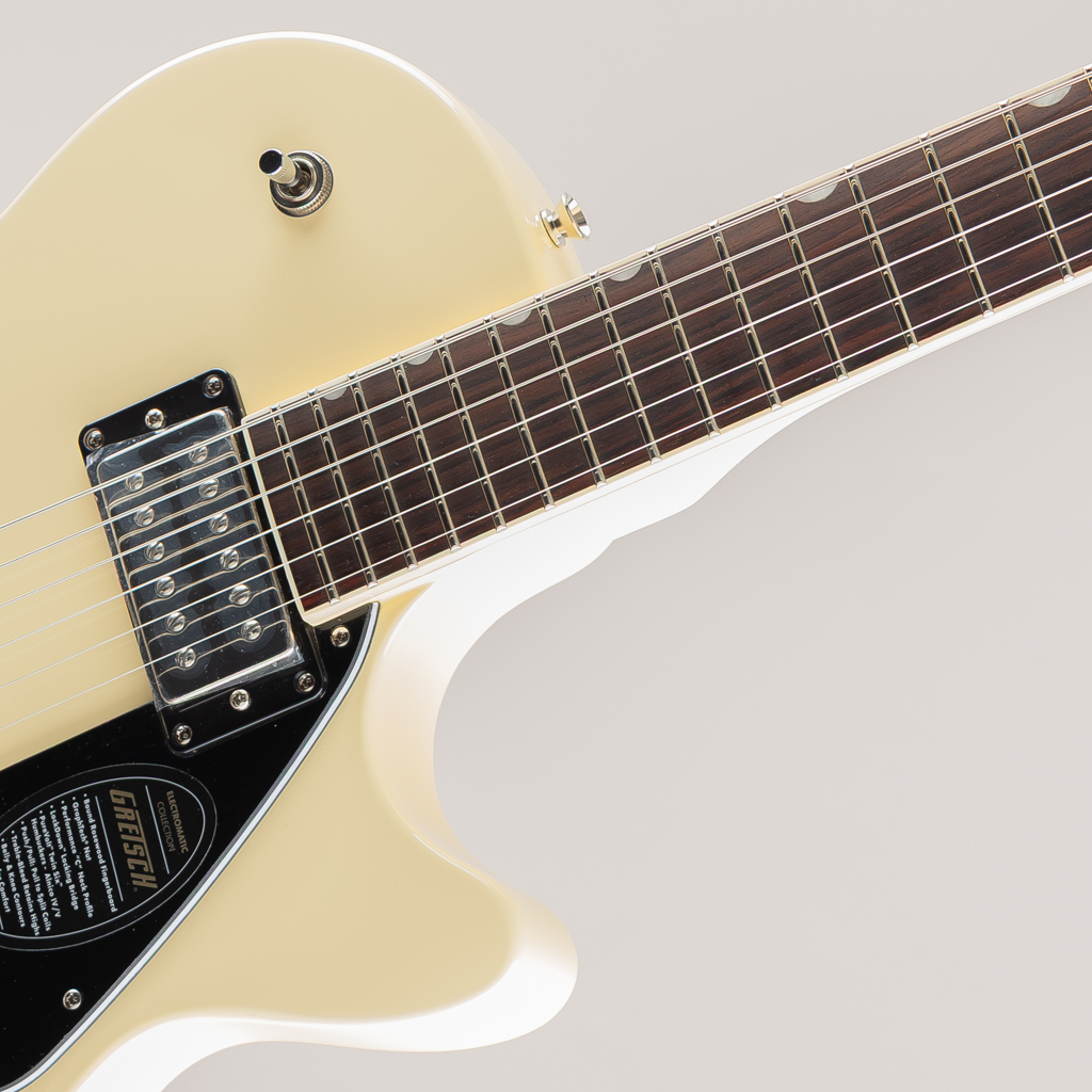 Electromatic Collectionは、ピュアなGretschパワーと伝統に忠実な仕様を求めるプレイヤーに最適な製品をラインナップしています。グレッチギターの象徴的なスタイルと優れた演奏性を兼ね備えたElectromatic Jet Clubは、力強いクリーントーンから灼熱のようなオーバードライブサウンドまで、指先ひとつで自在に表現できます。驚きをもたらすこのギターは、妥協なき演奏性、パワフルな多様性、洗練されたパフォーマンスを実現します。 <洗練されたボディコンターとラウンドネックヒール設計を備えたチェンバードマホガニーボディ> Electromatic Jetには、優れたアコースティックバランスと力強いアタックを実現するために、チェンバー加工が施されたマホガニーボディが採用されています。滑らかに丸められたネックヒール形状により、ハイポジションへのスムーズなアクセスが可能となり、ボディに施されたさりげないコンフォートコンターが、演奏時の快適さとバランスの取れたフィット感を生み出します。 <滑らかな演奏性を実現する“C”シェイプのマホガニーネックとバウンドローズウッド指板> ネックはバランスの取れた丸みのある"C"ネックシェイプで、テーパードショルダーデザインを採用することですべてのプレイヤーに快適な演奏経験をもたらします。適度な質量感が、全ポジションでの正確な演奏性を実現します。また、ネックに採用されているマホガニー材は力強く豊かなトーンを実現するのに理想的なサウンドキャラクターを備えています。指板は、トーンと演奏性を決定づける非常に重要なパーツです。Electromatic Jetは、のエイジドホワイトバインディングが施された本物の1-plyローズウッド指板を採用しており、滑らかでシルキーな弾き心地と、温かみのあるウッディなトーンを生み出します。 <チューニングの安定性を高めるGRAPHTECH NUBONEナット> GraphTech製のNuBoneナットは、均一でバランスの取れたトーン、豊かなレゾナンスとサスティンを実現します。弦の最適なブレイクアングルにより理想的なテンション感を確保し、ナット部における弦の引っかかり問題を解消します。長時間に及ぶ激しい演奏においても安定したチューニングを維持します。 <PUREVOLT TWIN SIXハムバッカー> PureVolt Twin Sixハムバッカーは、美しくダイナミックな表現力に溢れ、プレイヤーを虜にさせるパワーを誇ります。各ピックアップには、正確なアタックと自由自在な柔軟性を実現する、12個の調整可能なポールピースが搭載されています。ネックポジションにはアルニコIVマグネットとプレーンエナメルワイヤー、ブリッジポジションには、アルニコVマグネットは特別に調整されたプレーンエナメルコーティングワイヤーよってペアリングされており、明瞭かつ柔軟なトーンを特徴とした優れたバランスと荒々しいハムバッカーサウンドを生み出します。さらに、真空ワックスポッティングによってノイズや干渉を最小限に抑えます。 <Lockdownロッキングアジャスタブルラップアラウンドブリッジ> Lockdownロッキングアジャスタブルラップアラウンドテイルピースは、シンプルさと機能性を兼ね備えています。ブリッジとテイルピースが一体化したこのユニットは、サスティンと音の立ち上がりを向上させ、調整可能なサドルによって正確なイントネーションが得られます。ブリッジポストによってブリッジをしっかりと固定することで、弦のエネルギーを最大限に伝達し、安定したチューニングとスムーズな弦交換を可能にします。その結果、よりスケール感の大きい豊かなトーンに加え、パーカッシブなアタックとロングサスティンを実現します。 <洗練されたエレクトロニクス> Electromatic Jetのコントロール回路は、トーンを完全にコントロールできるよう設計されています。マスターボリュームにはトレブルブリード回路が組み込まれており、音量の大小に関わらず常にトーンの明瞭さを保ちます。マスタートーンは直感的に操作でき、どの設定でも優れたトーンが得られます。また、トーンコントロールのプッシュ/プルスイッチを引き上げることで、歯切れの良い、クリアなシングルコイルサウンドを手に入れられます。センターポジションでは2つのシングルコイルが組み合わさって、ハムキャンセル効果も発揮します。 Body Material: Chambered Mahogany Body Finish: Gloss Polyester Neck: Mahogany Neck Finish: Gloss Fingerboard: Bound Rosewood Frets: 22 Fret Size:Medium Jumbo Tuning Machines:Die-Cast Sealed Scale Length:24.6" (625 mm) Bridge:LockDown Locking Bridge Pickups:PureVolt Twin Six Humbucker Pickup 3-Position Toggle: Position 1. Bridge Pickup, Position 2. Middle and Neck Pickups, Position 3. Neck Pickup Controls: Master Volume with Treble-Bleed, Tone 1. (Neck Pickup), Tone 2. (Bridge Pickup) Auxiliary Switching:Push-Pull on each Tone Control Splits Bridge and Neck Pickups Respectively Special Electronics:Treble Bleed; Push-Pull Pot On Tone Pots For Coil Splits Hardware Finish: Nickel Strings: Nickel Plated Steel (.010-.046 Gauges)