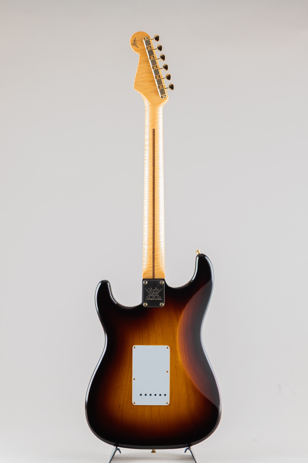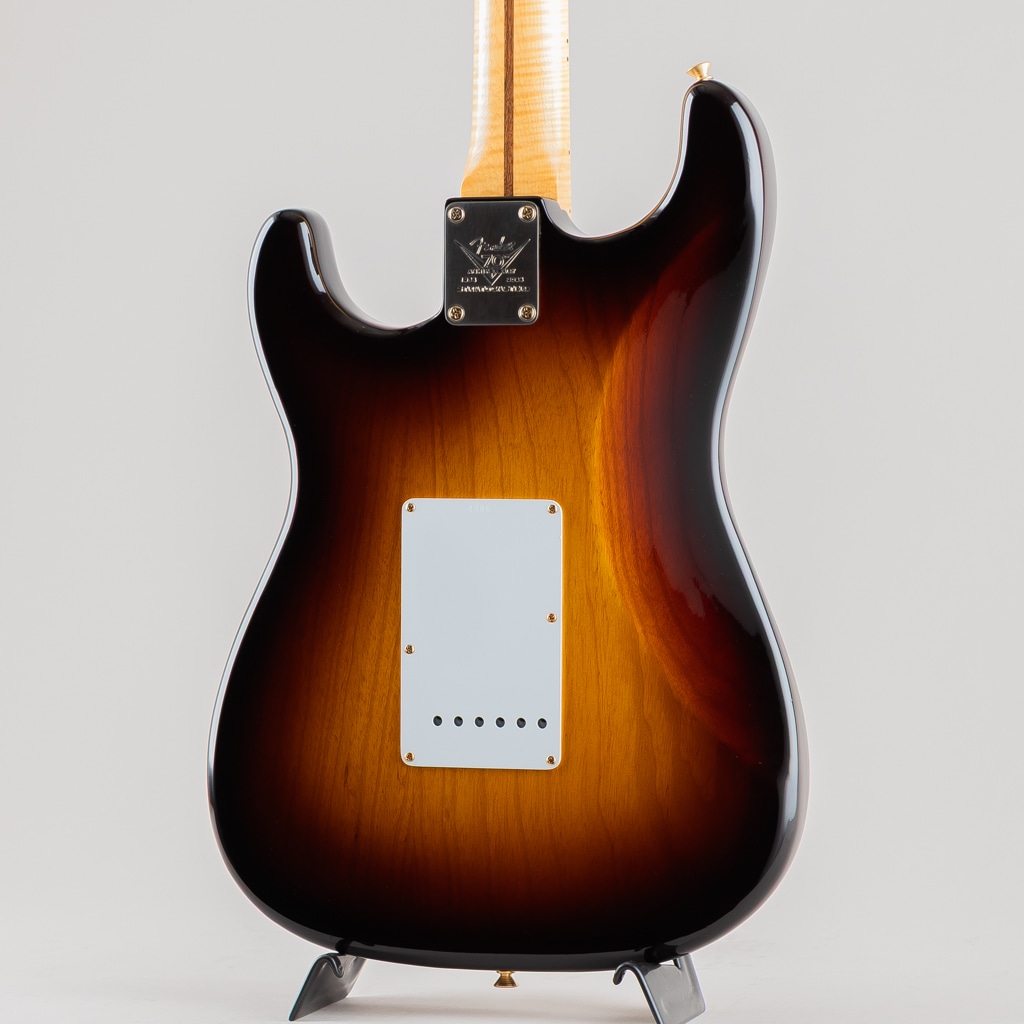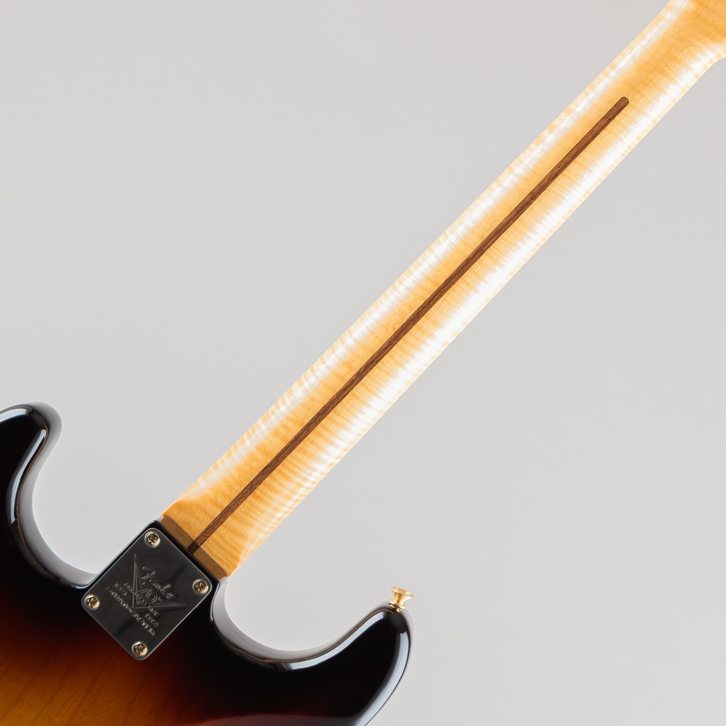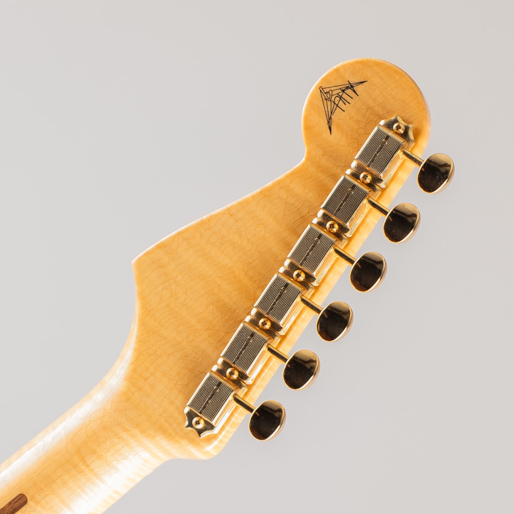 こちらはマスタービルダー、Andy Hicksが手がけた一本、厳選したオフセットシームのアッシュボディーに5Aグレードのフレイムメイプルネックを採用、極薄のフィニッシュにびっしりと入ったウェザーチェック、ゴールドハードウェア等、70周年を記念する特別なモデルに相応しい仕様となっております。