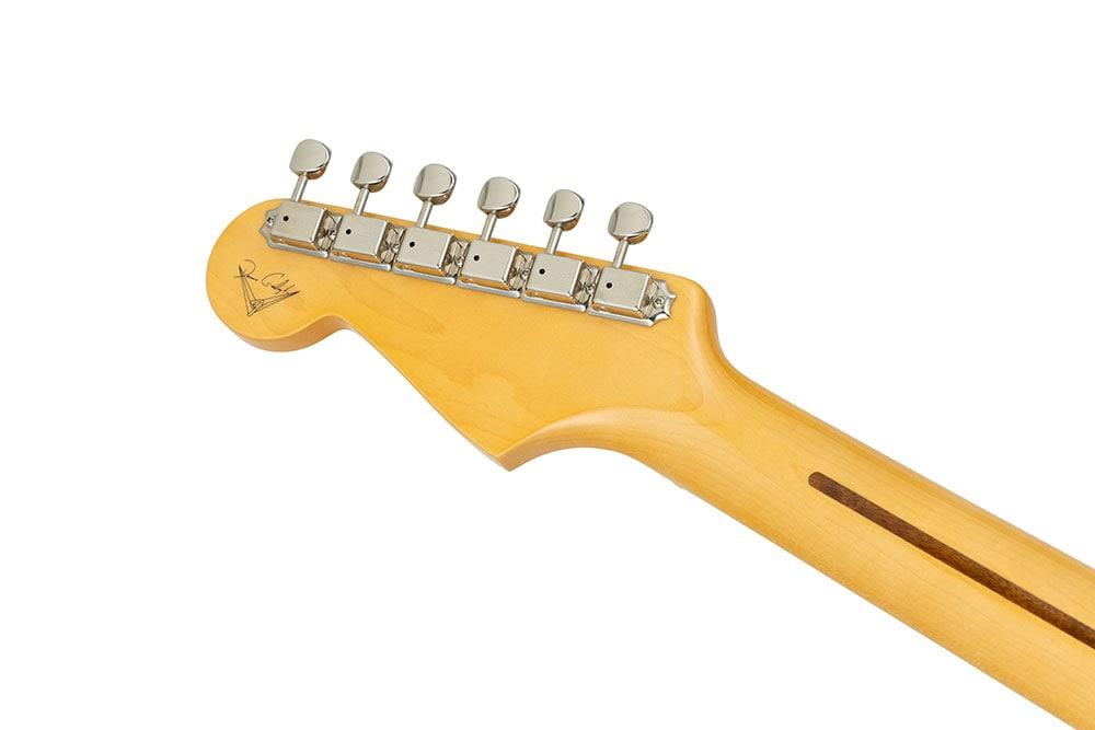 ネックには彼のシグネイチャーモデルでは初めてメイプル1ピースを採用し、ストラトキャスターのヘッドストックとの組み合わせが目を惹きます。ボディカラーのデザート・サンドとブラックのアノダイズ