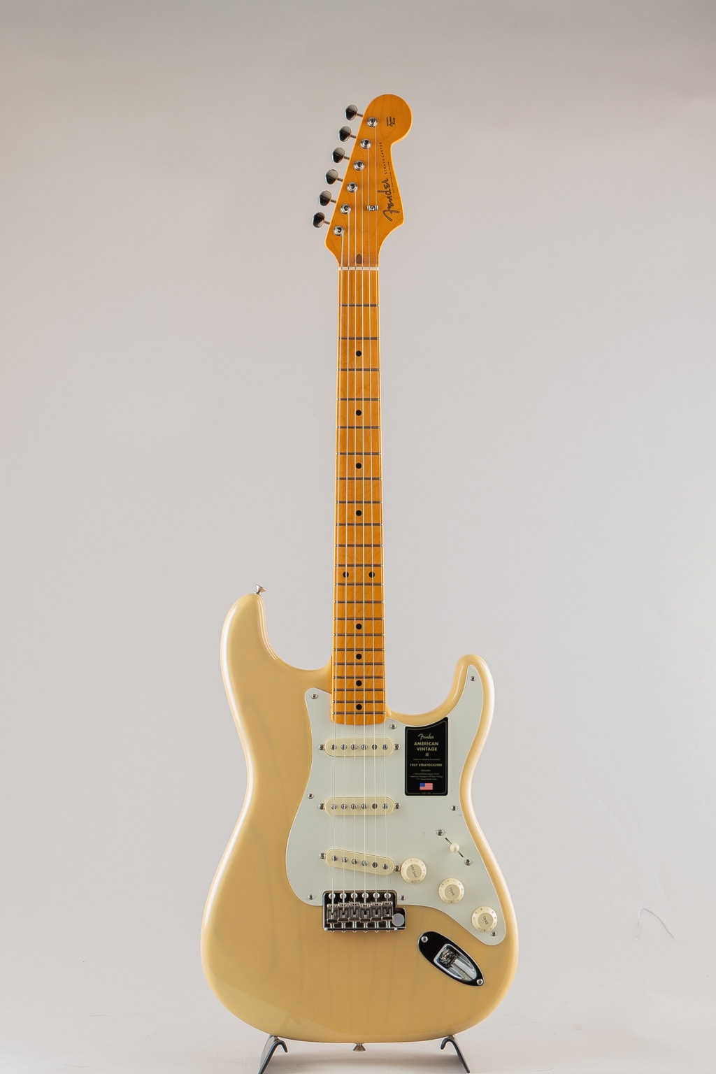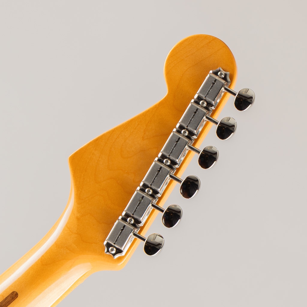 American Vintage II 1957 Stratocasterは、Pure Vintage '57 Stratocasterピックアップを3基搭載し、滑らかなボディコンター、7.25インチラジアスのメイプル指板を備えたVシェイプネックが特徴で、1957年に存在していたオリジナルモデルのトーンとフィーリングを再現しています。また、コールドロールド(冷間圧延)スチールブロックとベントスチールサドルを備えたPure Vintage Synchronized Tremolo、Fender Deluxeチューニングマシン、1-plyピックガードなどのプレミアムな仕様が採用されています。