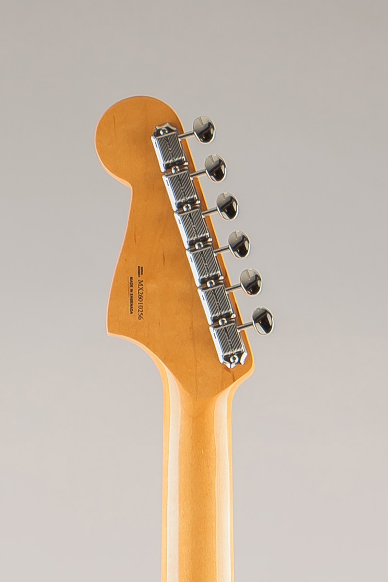 オーセンティックな60年代中期の“C”シェイプネックは、手に自然に馴染む、どこか懐かしい弾き心地を提供。7.25インチラジアス指板とヴィンテージトールフレットが、抜群の快適性と優れた演奏性を実現します。 サウンドの要となるピックアップには、丁寧に作り込まれた60年代中期仕様のヴィンテージスタイルJazzmasterピックアップを2基搭載し、Fenderサウンドを確立したブライトでエッジの効いたトーン、そして温かくウッディなミッドレンジを余すことなく表現します。ヴィンテージスタイルのフローティングトレモロブリッジとリズムサーキットスイッチは60年代らしい多彩な表現力とヴィブラートを提供します。ヴィンテージスタイルの様々なディテールがクラシックな美しさをエンハンスし、当時に忠実なチューニングマシンが高いチューニング精度を実現します。