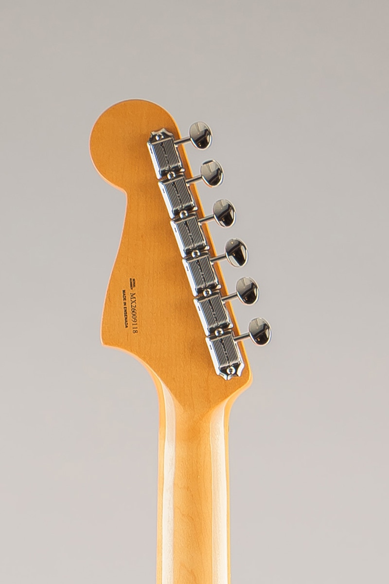 オーセンティックな60年代中期の“C”シェイプネックは、手に自然に馴染む、どこか懐かしい弾き心地を提供。7.25インチラジアス指板とヴィンテージトールフレットが、抜群の快適性と優れた演奏性を実現します。 サウンドの要となるピックアップには、丁寧に作り込まれた60年代中期仕様のヴィンテージスタイルJazzmasterピックアップを2基搭載し、Fenderサウンドを確立したブライトでエッジの効いたトーン、そして温かくウッディなミッドレンジを余すことなく表現します。ヴィンテージスタイルのフローティングトレモロブリッジとリズムサーキットスイッチは60年代らしい多彩な表現力とヴィブラートを提供します。ヴィンテージスタイルの様々なディテールがクラシックな美しさをエンハンスし、当時に忠実なチューニングマシンが高いチューニング精度を実現します。