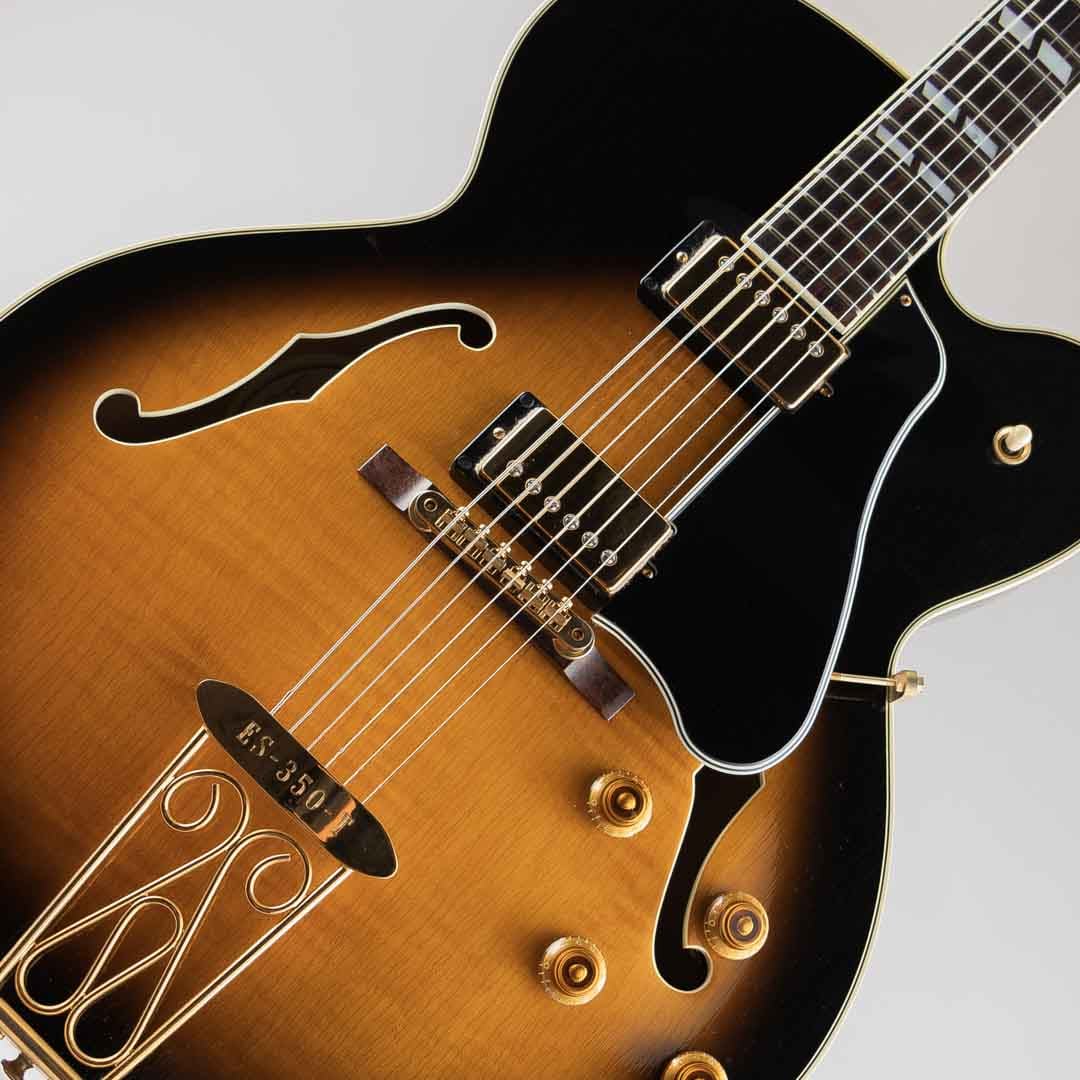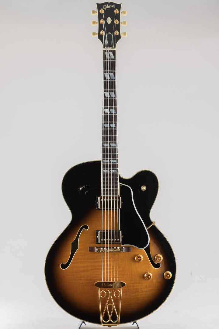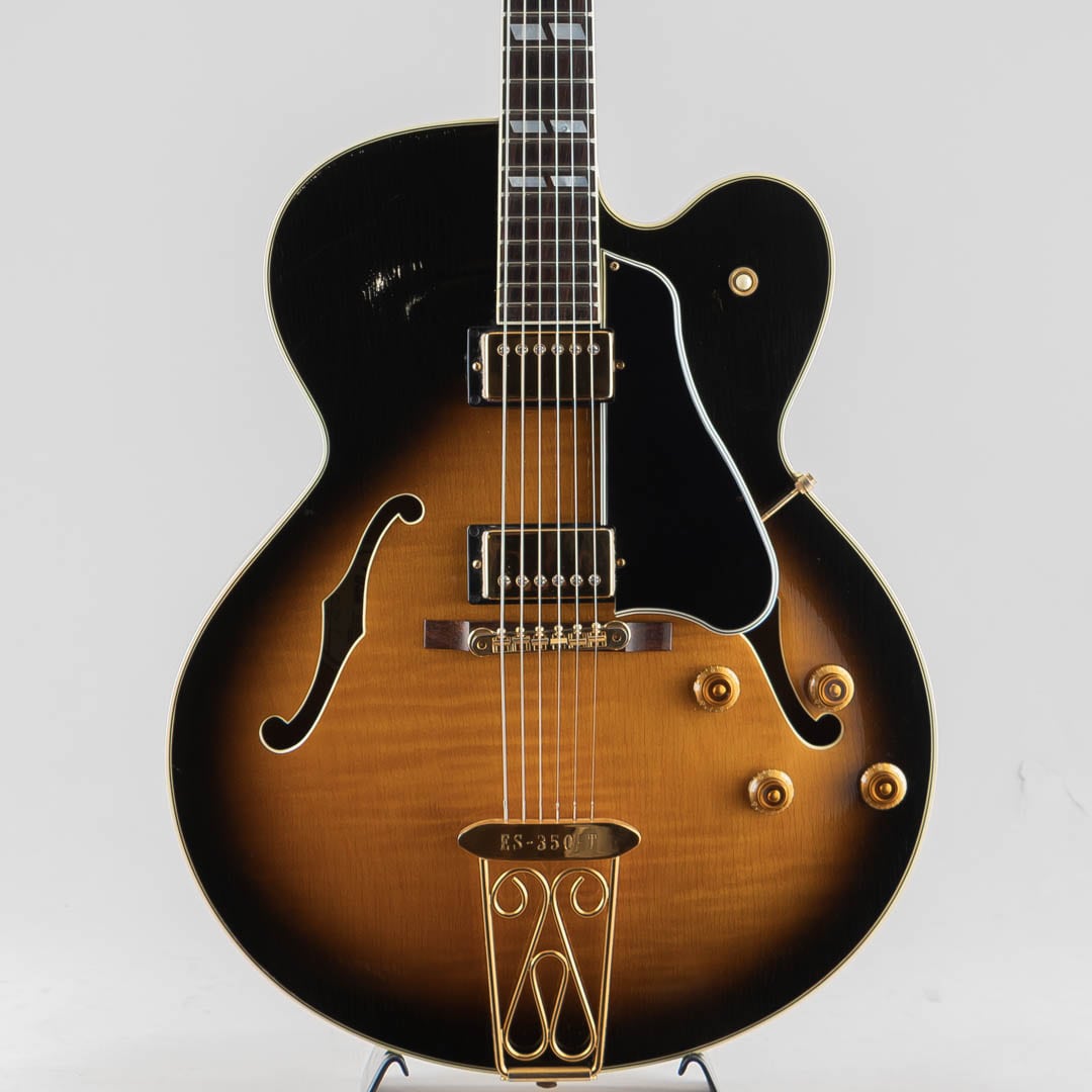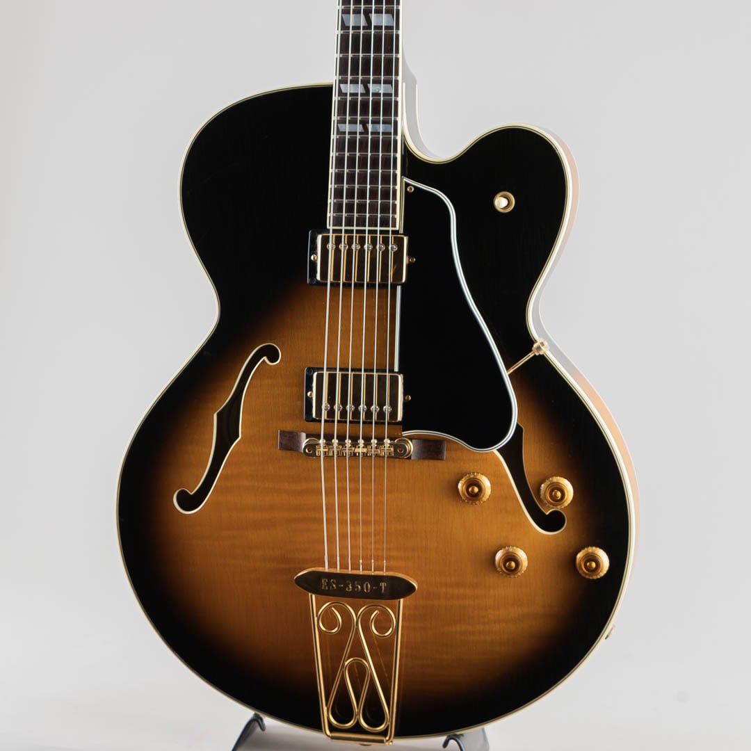 1955年当時、ES-350のボディ厚を薄くし、ショートスケールにてリリースされたES-350T。1955年から1963年ごろまでは、同時期に発表されたByrdlandと同じくショートスケールネックにて発売されていたこともあり、Byrdlandの兄弟機のような立ち位置。63年末に一度生産が終了し、その後、77年〜81年の間ロングスケールにて復活を果たします。この度入荷いたしましたのは、1992〜1993年の間、77〜81年のスペックにて限定販売されておりました個体となります。ウッドマテリアルはラミネイトメイプルボディ/3ピースメイプルネック/ローズウッド指板にて構成。ベネチアンカッタウェイ、"ES-350T"エングローブ入りテイルピース、ゴールドハードウェア等、Byrdlandに引けを取らない豪華なルックス。本機のナット幅は43mmほどで、緩やかなカーブを描いたネックシェイプ。ショートスケール個体のサウンドはどことなくタイトな印象で明るい印象ですが、こちらはGibsonらしいダークさがありながらもしっかりとした輪郭を感じられる鳴り。ピックアップには57 Classicを2機搭載しており、上記の鳴りに中音域の美味しい部分がぎゅっと詰まりながらもいなたさを感じさせるグッドサウンドでございます。