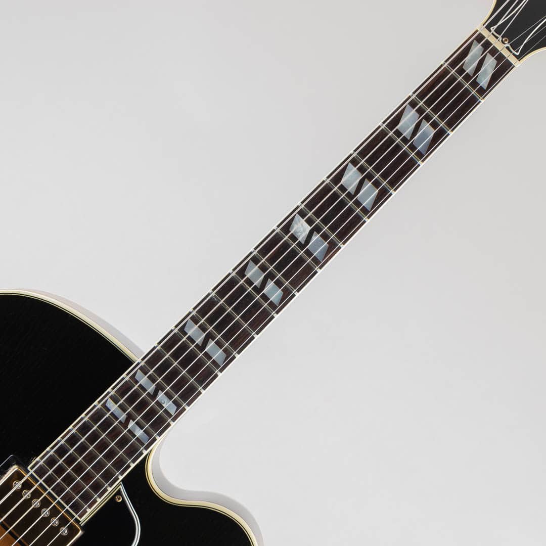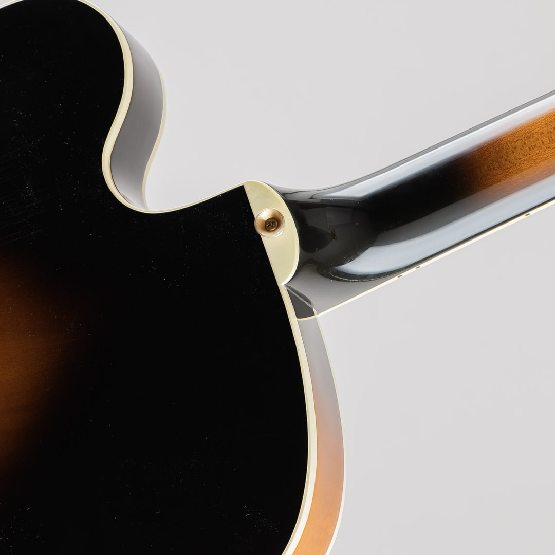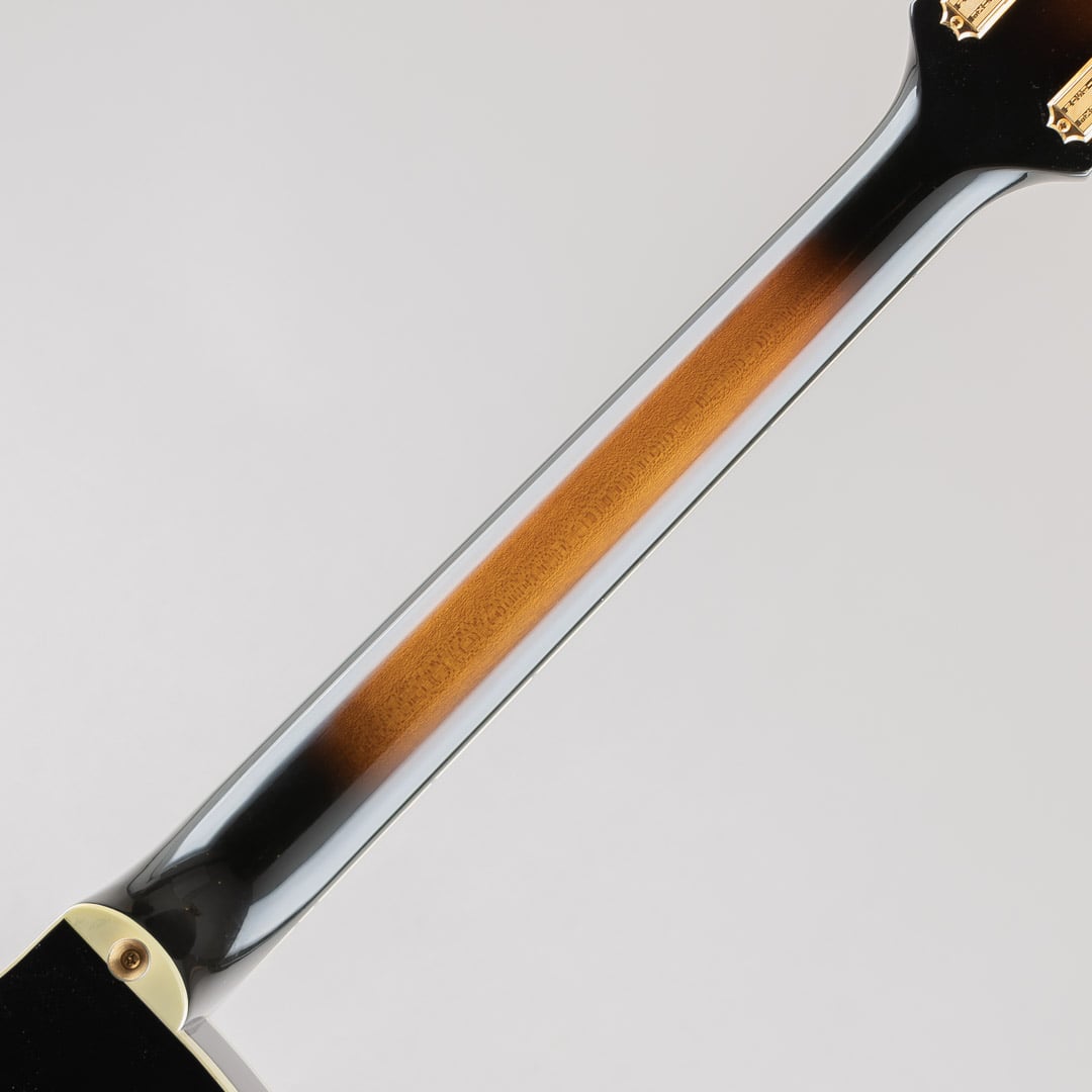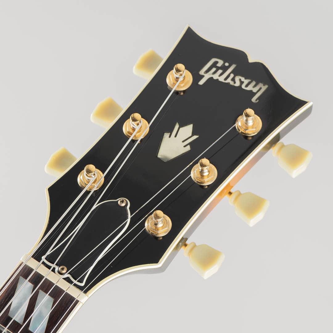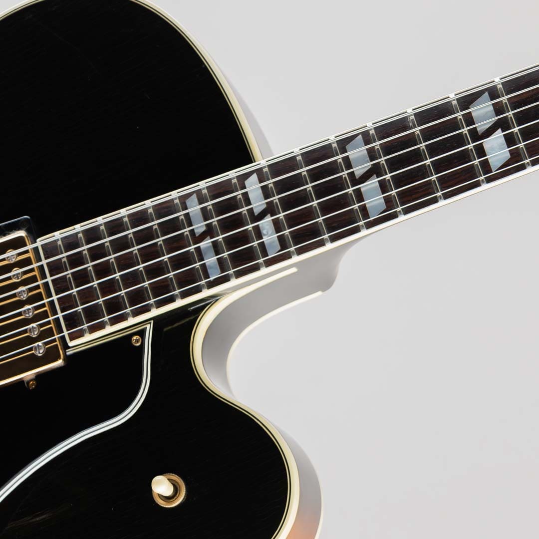 1955年当時、ES-350のボディ厚を薄くし、ショートスケールにてリリースされたES-350T。1955年から1963年ごろまでは、同時期に発表されたByrdlandと同じくショートスケールネックにて発売されていたこともあり、Byrdlandの兄弟機のような立ち位置。63年末に一度生産が終了し、その後、77年〜81年の間ロングスケールにて復活を果たします。この度入荷いたしましたのは、1992〜1993年の間、77〜81年のスペックにて限定販売されておりました個体となります。ウッドマテリアルはラミネイトメイプルボディ/3ピースメイプルネック/ローズウッド指板にて構成。ベネチアンカッタウェイ、"ES-350T"エングローブ入りテイルピース、ゴールドハードウェア等、Byrdlandに引けを取らない豪華なルックス。本機のナット幅は43mmほどで、緩やかなカーブを描いたネックシェイプ。ショートスケール個体のサウンドはどことなくタイトな印象で明るい印象ですが、こちらはGibsonらしいダークさがありながらもしっかりとした輪郭を感じられる鳴り。ピックアップには57 Classicを2機搭載しており、上記の鳴りに中音域の美味しい部分がぎゅっと詰まりながらもいなたさを感じさせるグッドサウンドでございます。
