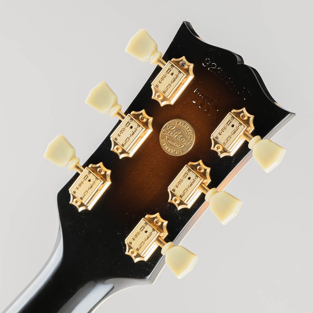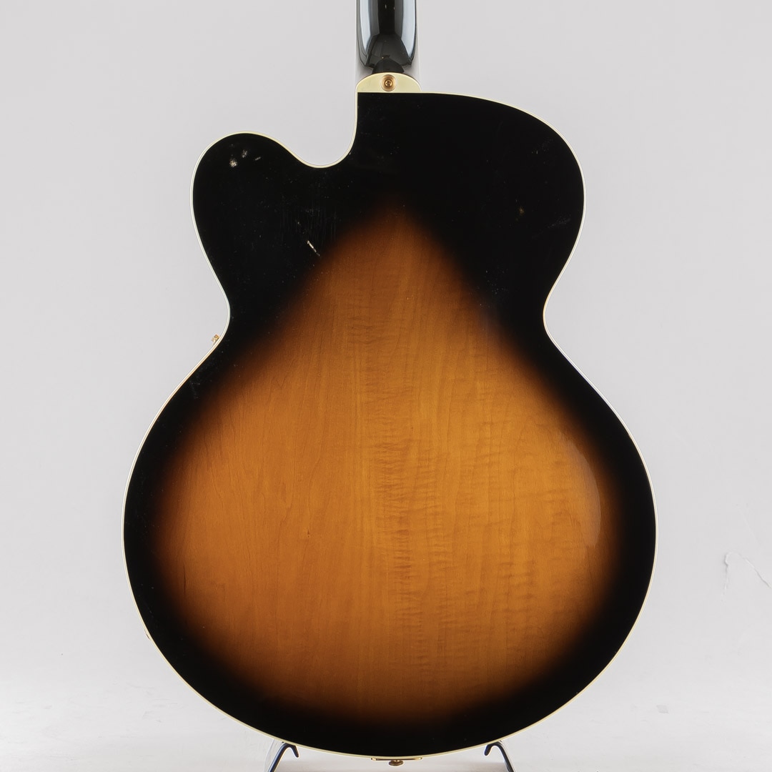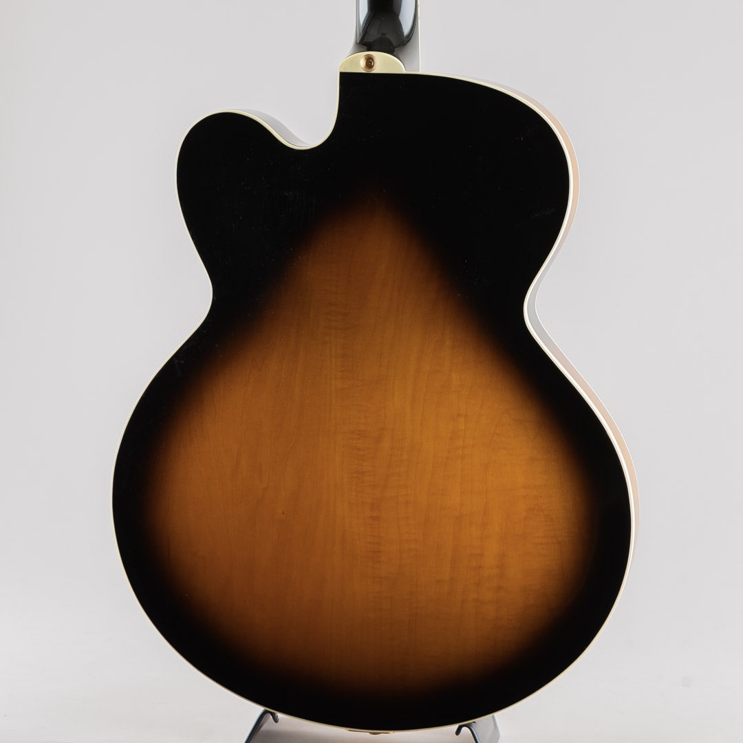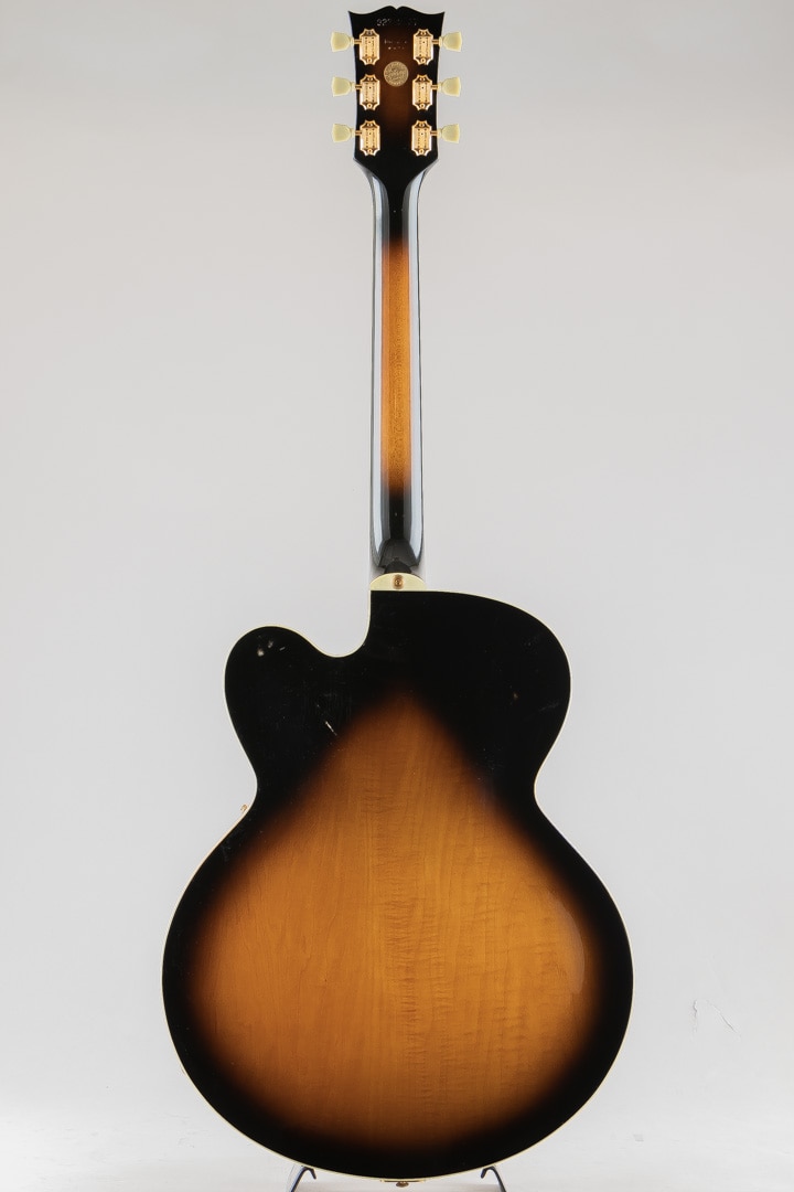 1955年当時、ES-350のボディ厚を薄くし、ショートスケールにてリリースされたES-350T。1955年から1963年ごろまでは、同時期に発表されたByrdlandと同じくショートスケールネックにて発売されていたこともあり、Byrdlandの兄弟機のような立ち位置。63年末に一度生産が終了し、その後、77年〜81年の間ロングスケールにて復活を果たします。この度入荷いたしましたのは、1992〜1993年の間、77〜81年のスペックにて限定販売されておりました個体となります。ウッドマテリアルはラミネイトメイプルボディ/3ピースメイプルネック/ローズウッド指板にて構成。ベネチアンカッタウェイ、"ES-350T"エングローブ入りテイルピース、ゴールドハードウェア等、Byrdlandに引けを取らない豪華なルックス。本機のナット幅は43mmほどで、緩やかなカーブを描いたネックシェイプ。ショートスケール個体のサウンドはどことなくタイトな印象で明るい印象ですが、こちらはGibsonらしいダークさがありながらもしっかりとした輪郭を感じられる鳴り。ピックアップには57 Classicを2機搭載しており、上記の鳴りに中音域の美味しい部分がぎゅっと詰まりながらもいなたさを感じさせるグッドサウンドでございます。