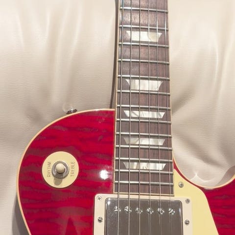 ウッドマテリアルは、フィギュアドメイプル / ソリッド・マホガニーバック / マホガニーネック / ローズウッド指板にて構成。ネックシェイプはグリップ感が心地よく、程よい太さのあるミディアムCシェイプでございます。ワイルドな広がりのある杢目、しっかりとした深さがあり、見る角度を変えることで表情を変える素晴らしいフレイムトップ。チェリーカラーとグロスフィニッシュの相性も素晴らしく、見ているだけで満足感を得られる見た目でございます。その他ABR-1ブリッジ / シングルライン・クルーソンペグ等の往年のスペックはもちろん踏襲されており、ロングテノンジョイント / オールニカワ接着ももちろん採用されております。
