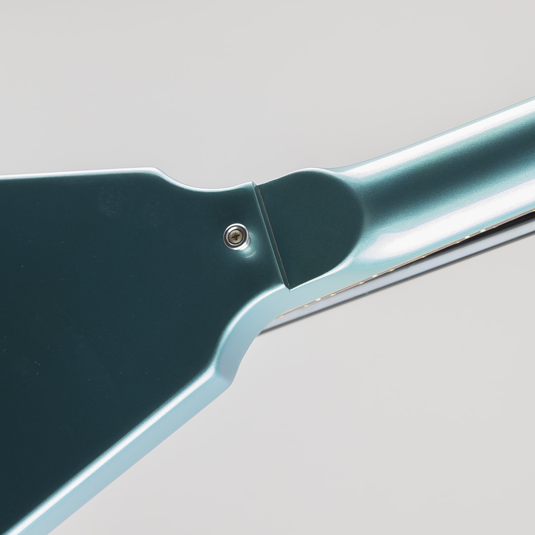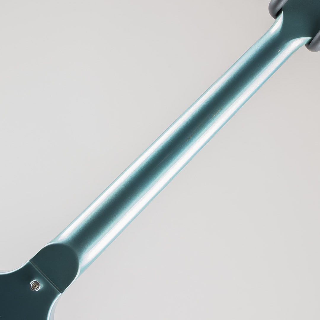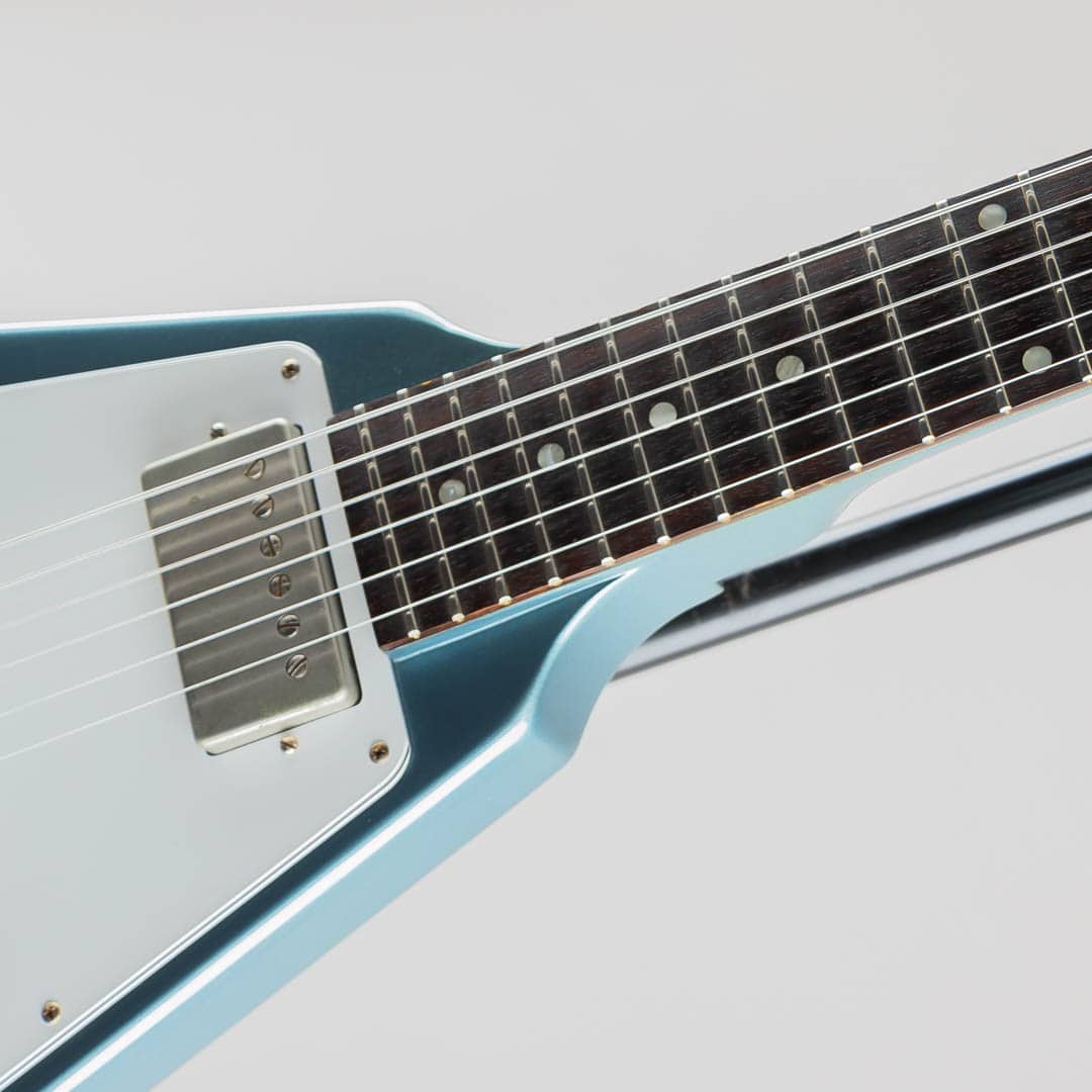 2013年製。日本市場限定モデルとして登場した本機。渋いペルハム・ブルーカラーが特徴的な1967 Flying Vが中古にて入荷いたしました。58年に初めてリリースされたFlying V。アルバートキングら著名なアーティストに使用されてきておりましたが、その先進的するボディスタイルはなかなかに浸透せず63年に一度生産が中止されます。そこからロックが台頭し始めるとともに66年に復活。本機はその67年ごろのスタイル、17フレットネックジョイント、ボディ全体を覆うピックガード、デザインが変更されたトラスロッドカバー、ストップテイルピース等を取り入れたモデルとなります。ウッドマテリアルはマホガニーボディ/マホガニーネック/ローズウッド指板にて構成。カラーにはPelhamblueを採用。フィニッシュはVOSとなります。ネックシェイプにはAuthentic '67 Medium C-Shapeを採用、丸みのある肉厚な握り心地ながら手に吸い付くようなグリップ感でございます。ピックアップにはCustombuckerを2機搭載。ズンズンとした低音域にマホガニー独特の甘さを感じられるサウンド、そこにCustombuckerのカリッとした枯れたニュアンスが加わることで、フレッシュさがありながらもどこかいなたさを感じられるサウンドクオリティ。