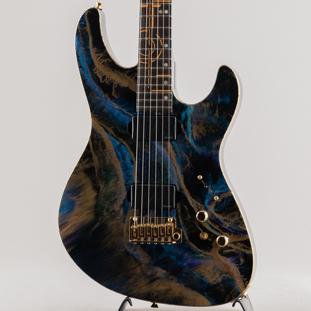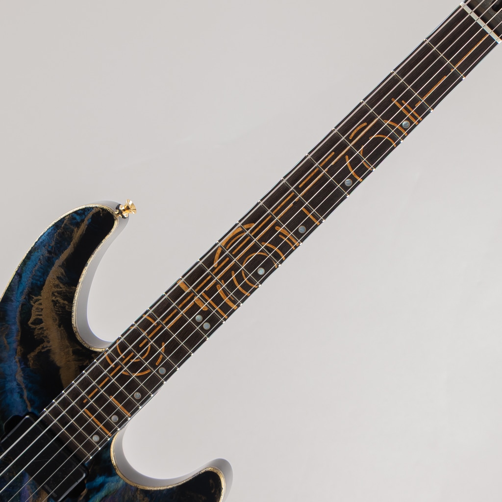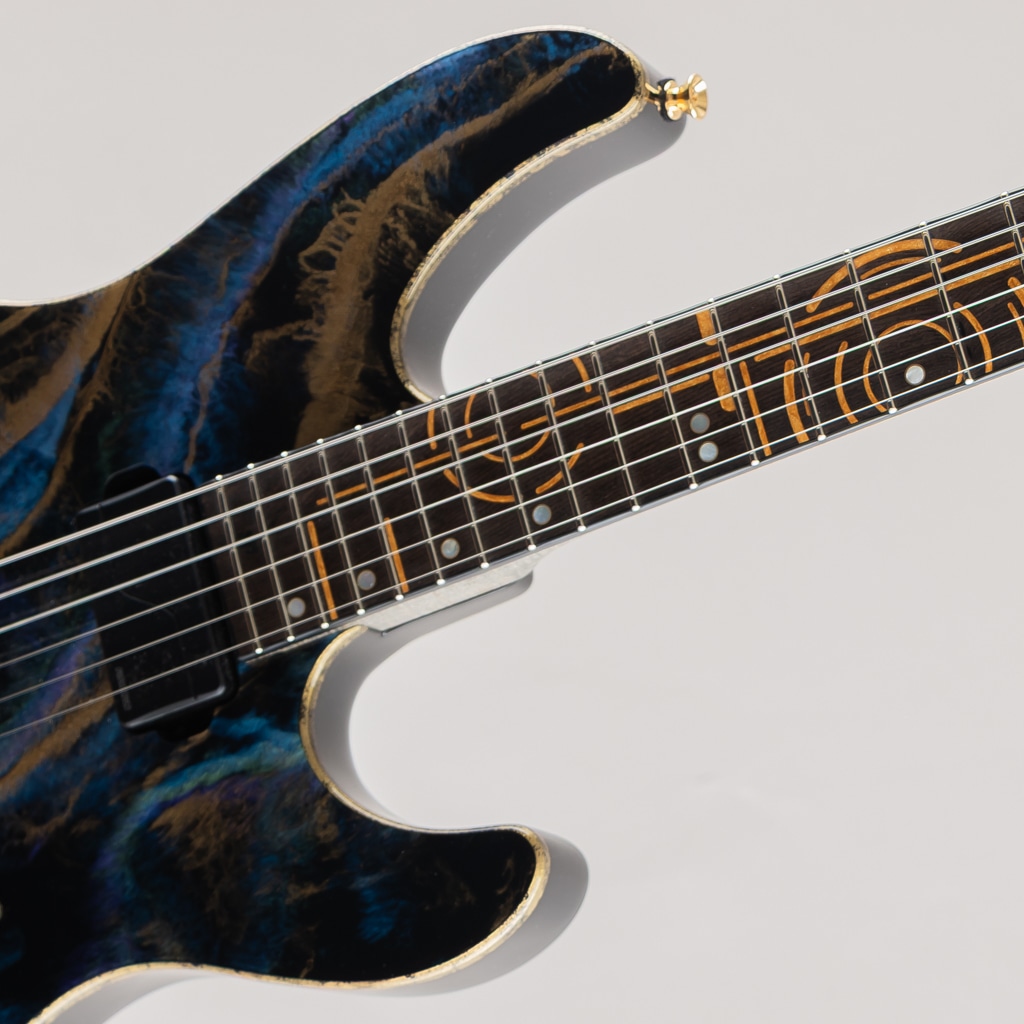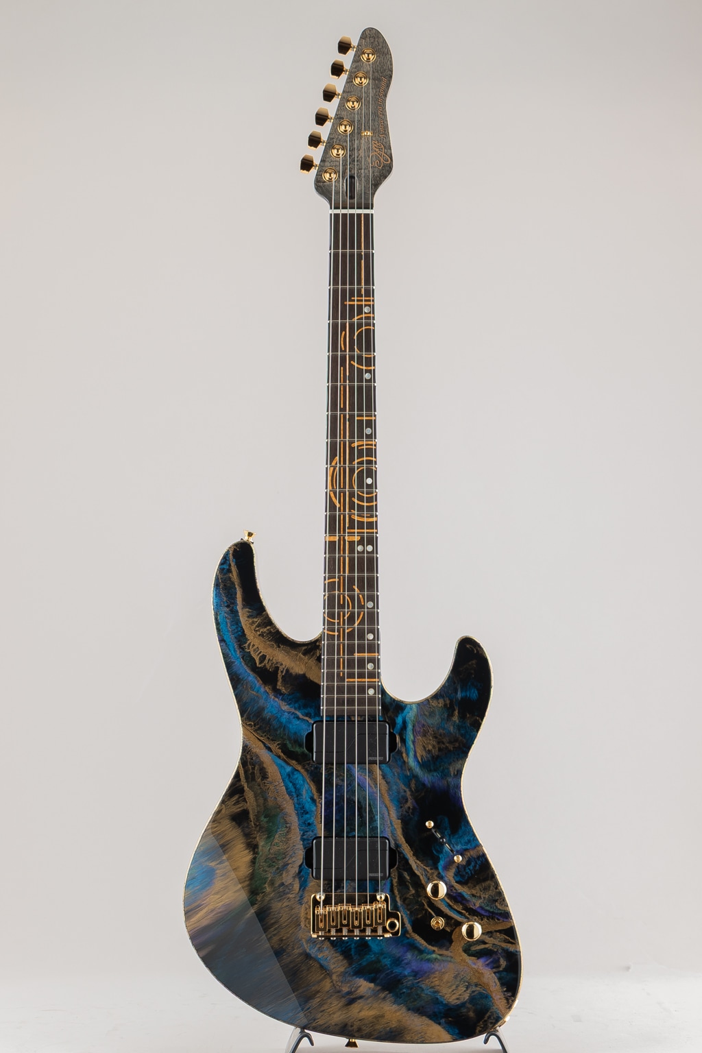 こちらはSTシェイプを基としたJASTERのショーモデル。アルダーボディに鮮やかなフィギュアドメイプルネック&エボニー指板。希少かつ個性的な木材に加え、レジンを流し彩られたボディのグラデーションが唯一無二の存在感を発揮しております。また指板面の幾何学的なデザインにもレジンを使用しており細かなポイントに職人の技を感じられます。