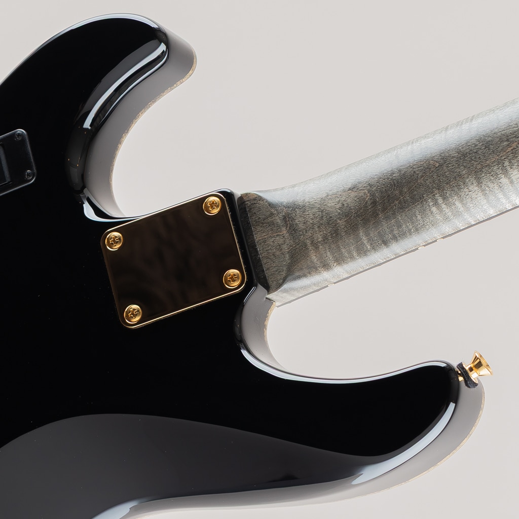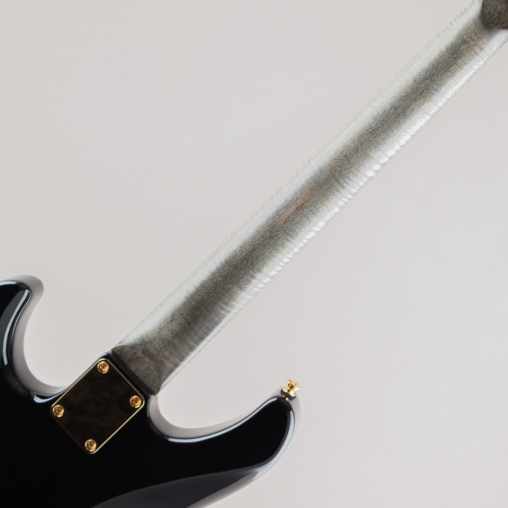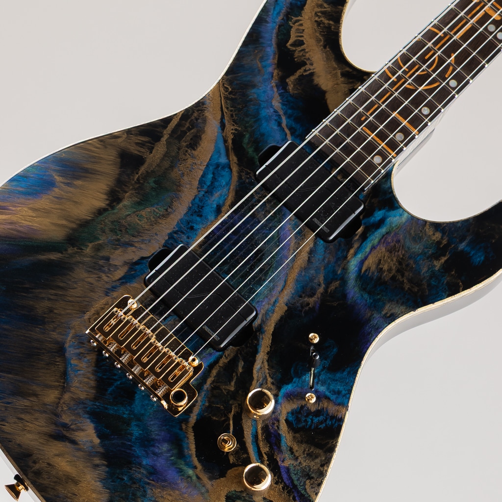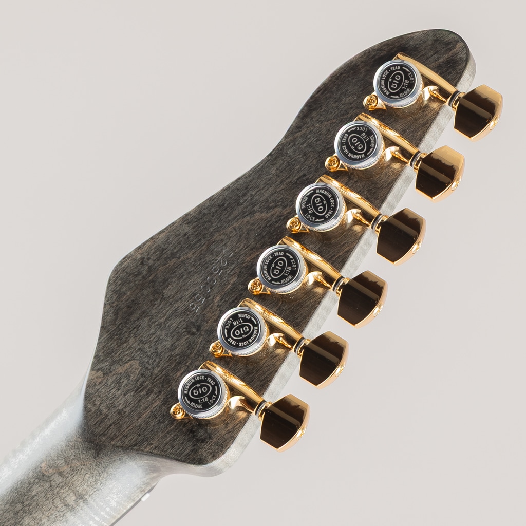 こちらはSTシェイプを基としたJASTERのショーモデル。アルダーボディに鮮やかなフィギュアドメイプルネック&エボニー指板。希少かつ個性的な木材に加え、レジンを流し彩られたボディのグラデーションが唯一無二の存在感を発揮しております。また指板面の幾何学的なデザインにもレジンを使用しており細かなポイントに職人の技を感じられます。