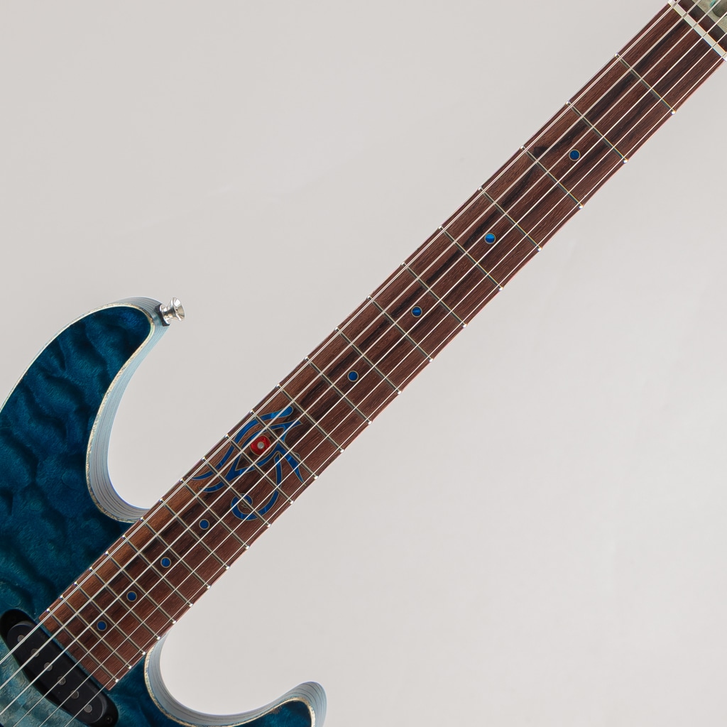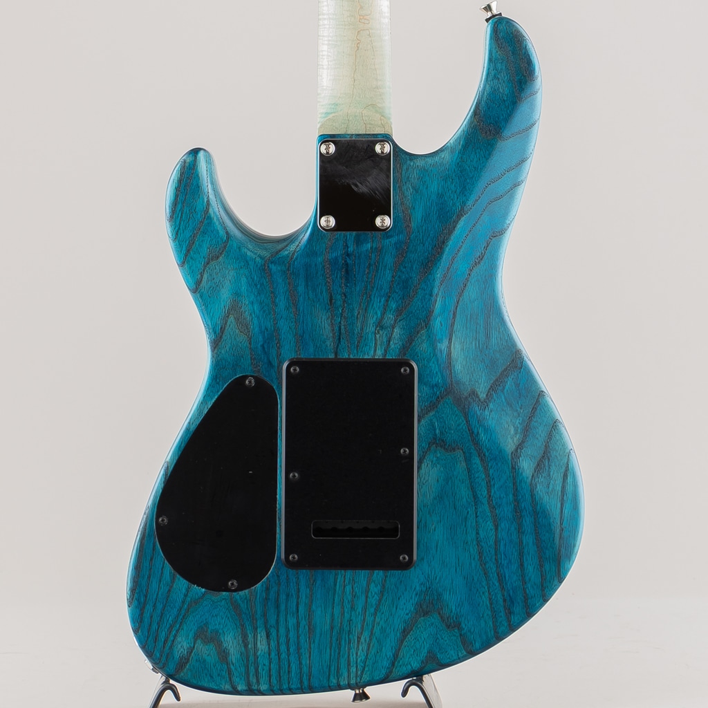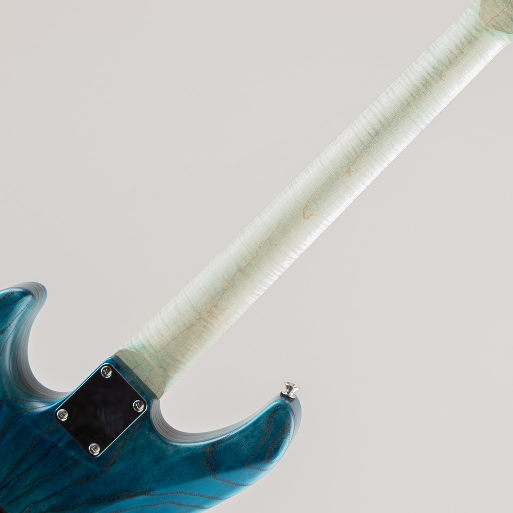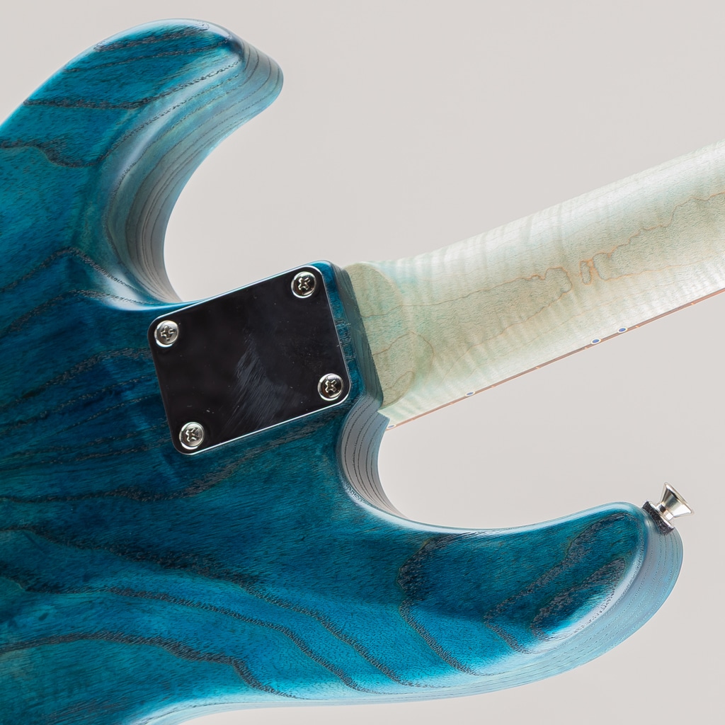 こちらはSTシェイプを基としたJASTERのショーモデル。杢の鮮やかなキルテッドメイプルトップのスワンプアッシュボディ、フィギュアドメイプルネックにマダガスカルローズウッド指板といった希少かつ個性的な木材を惜しみなく使用しております。コンター部分はまるで波のように美しく滑らかに掘り込まれており、加工技術と相まって唯一無二の存在感を発揮しております。