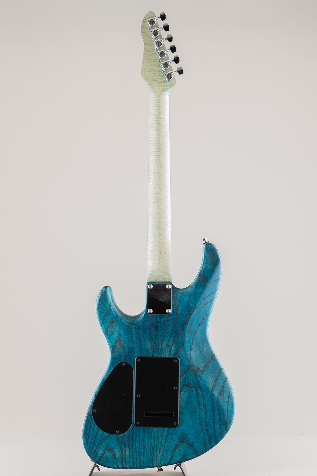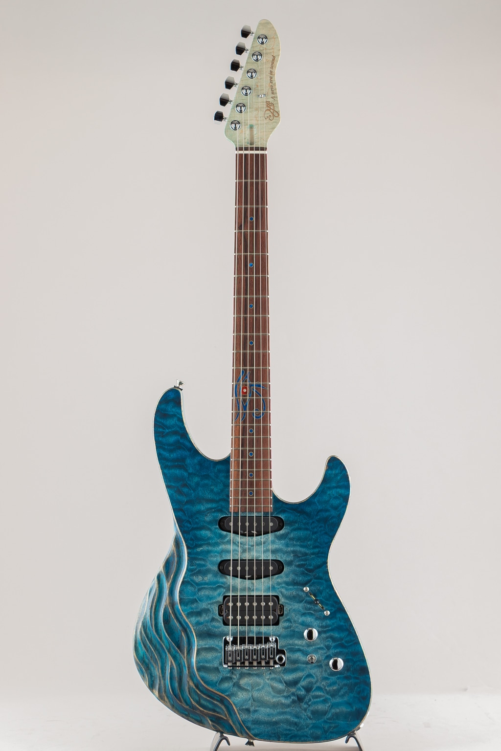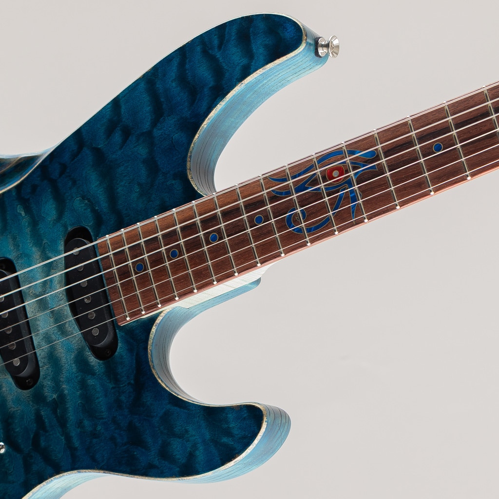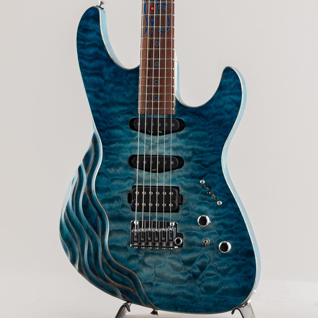 こちらはSTシェイプを基としたJASTERのショーモデル。杢の鮮やかなキルテッドメイプルトップのスワンプアッシュボディ、フィギュアドメイプルネックにマダガスカルローズウッド指板といった希少かつ個性的な木材を惜しみなく使用しております。コンター部分はまるで波のように美しく滑らかに掘り込まれており、加工技術と相まって唯一無二の存在感を発揮しております。