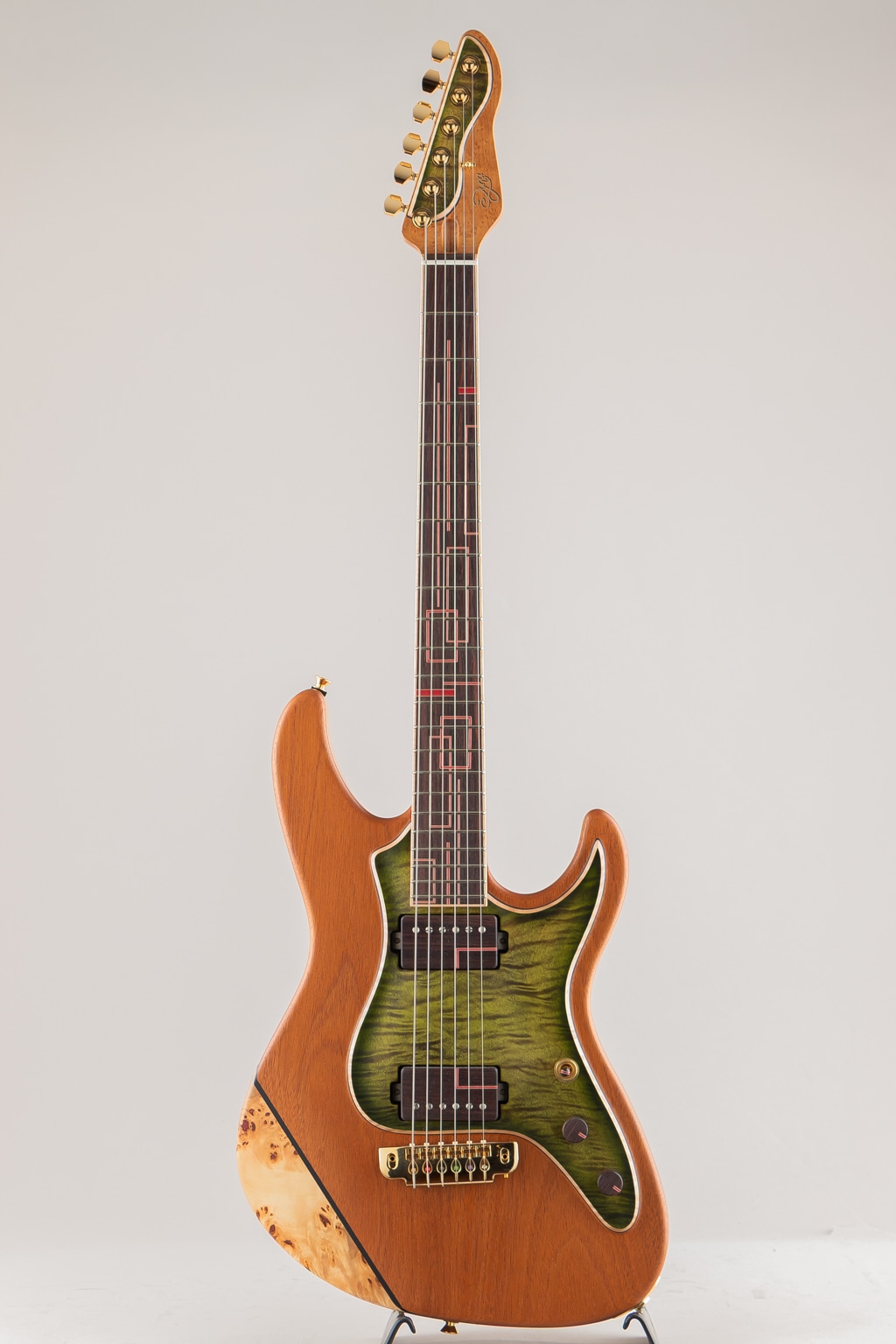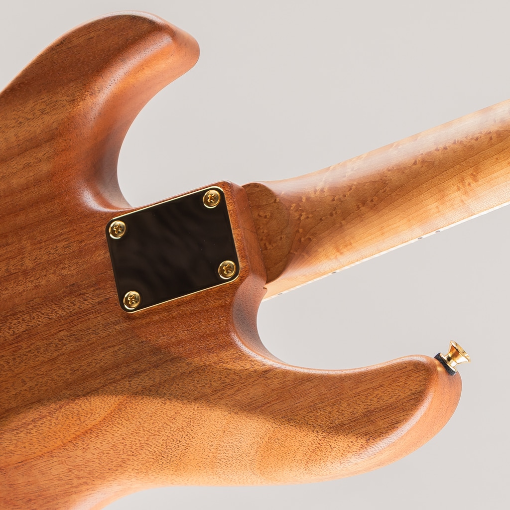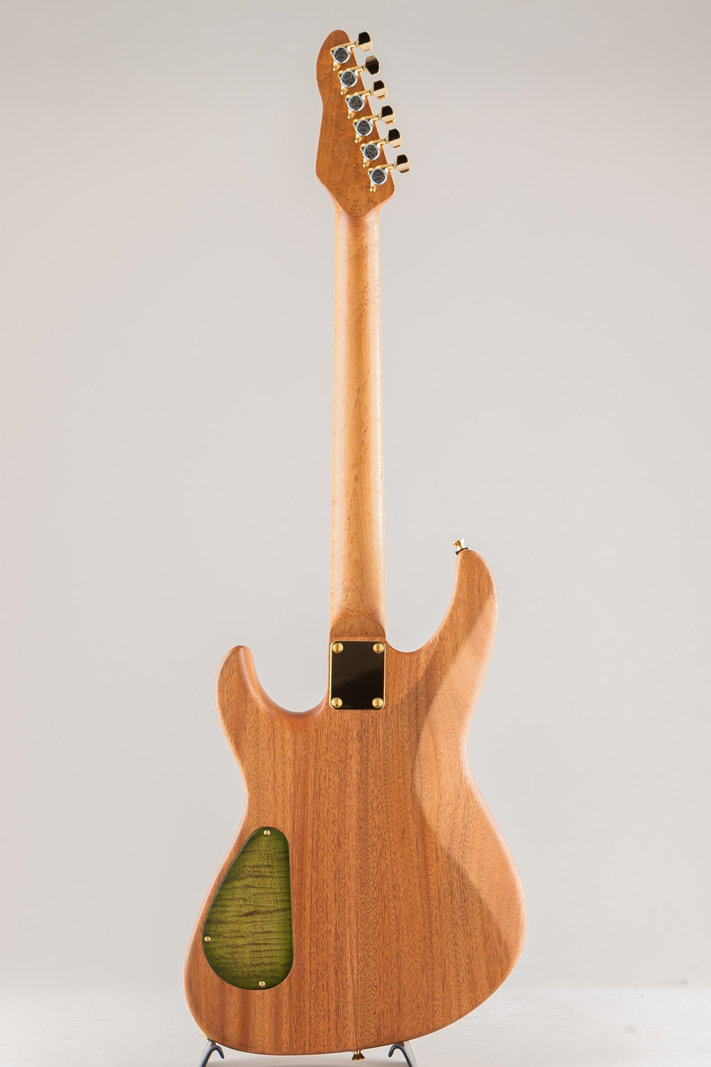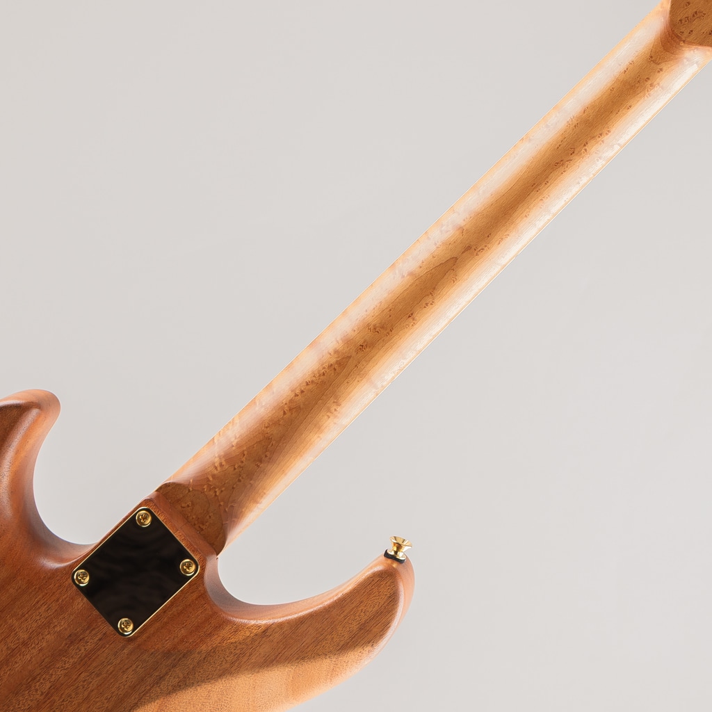 こちらはSTシェイプを基としたJASTERのショーモデル。鮮やかなローステッドバーズアイメイプルネック。ボディはホンジュラスマホガニーをトップ&バックでラミネートし、コンター部にバールポプラを採用。さらに美しいフィギュアドメイプルをピックガードと突板に見立て貼り合わせるという非常に個性あふれるデザインが唯一無二の存在感を発揮しております。緩やかにアーチのかかったトップのメイプルやピックアップカバー、バックプレートや各コントロールノブに至るまで細部にこだわりを感じられる1本です。