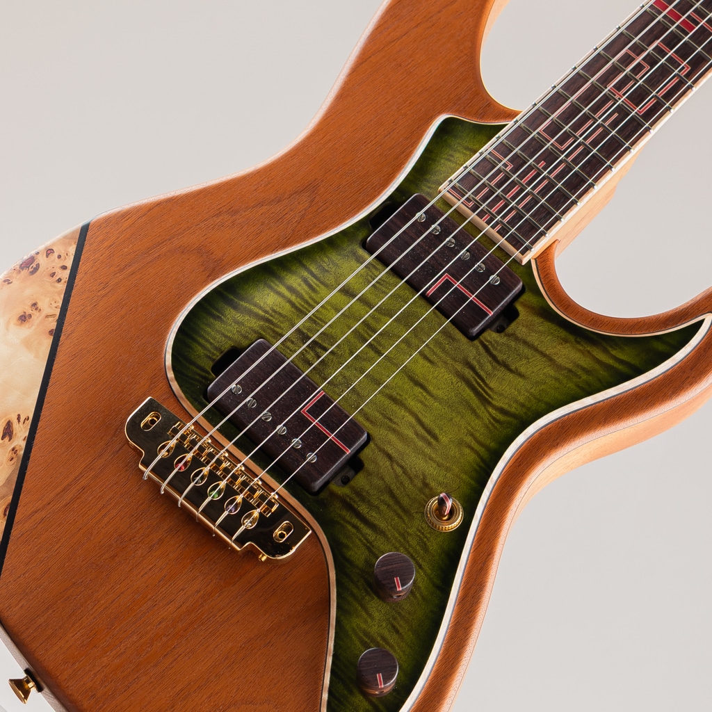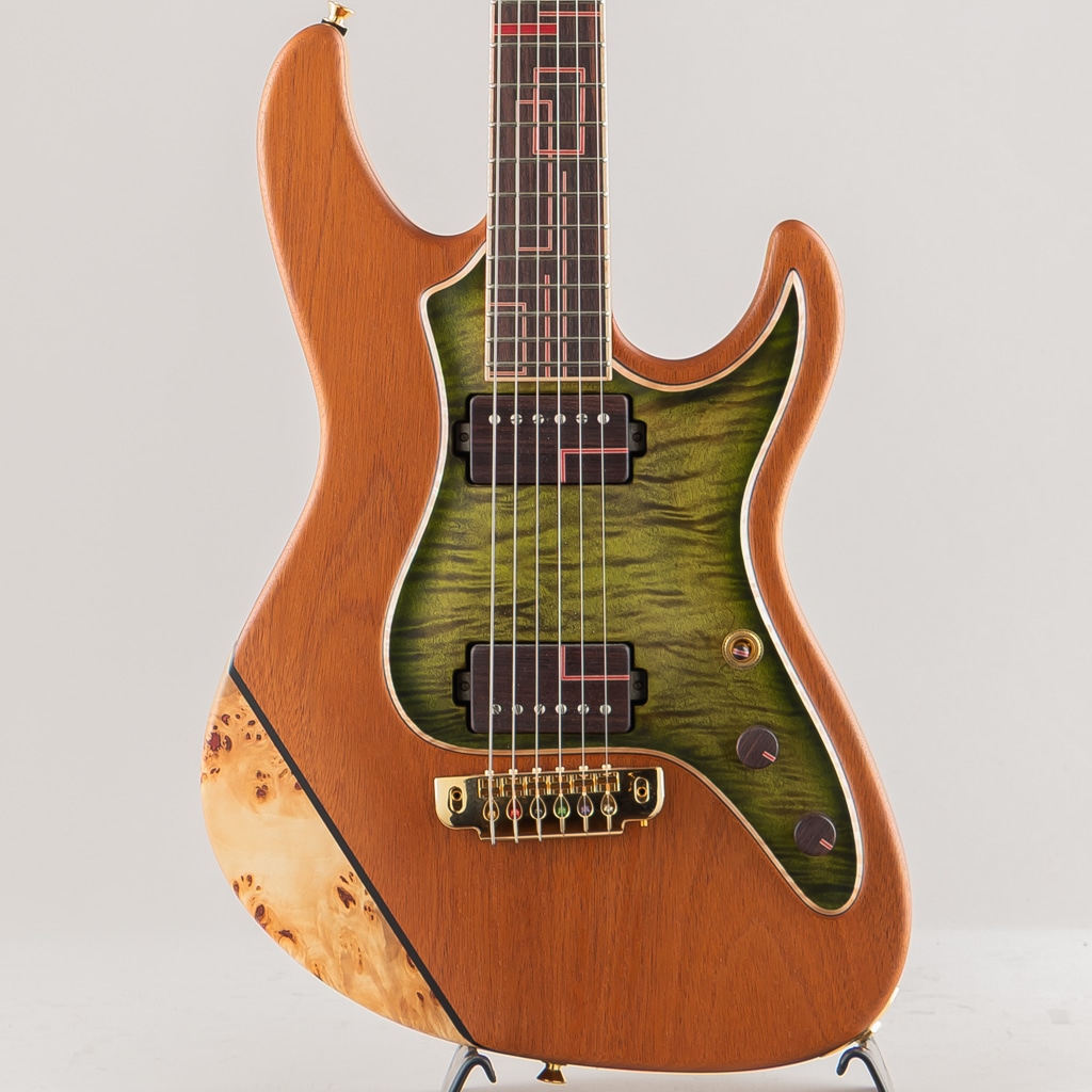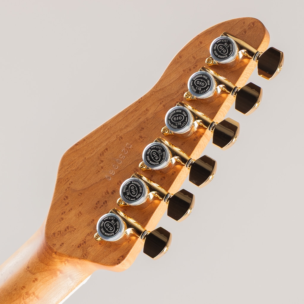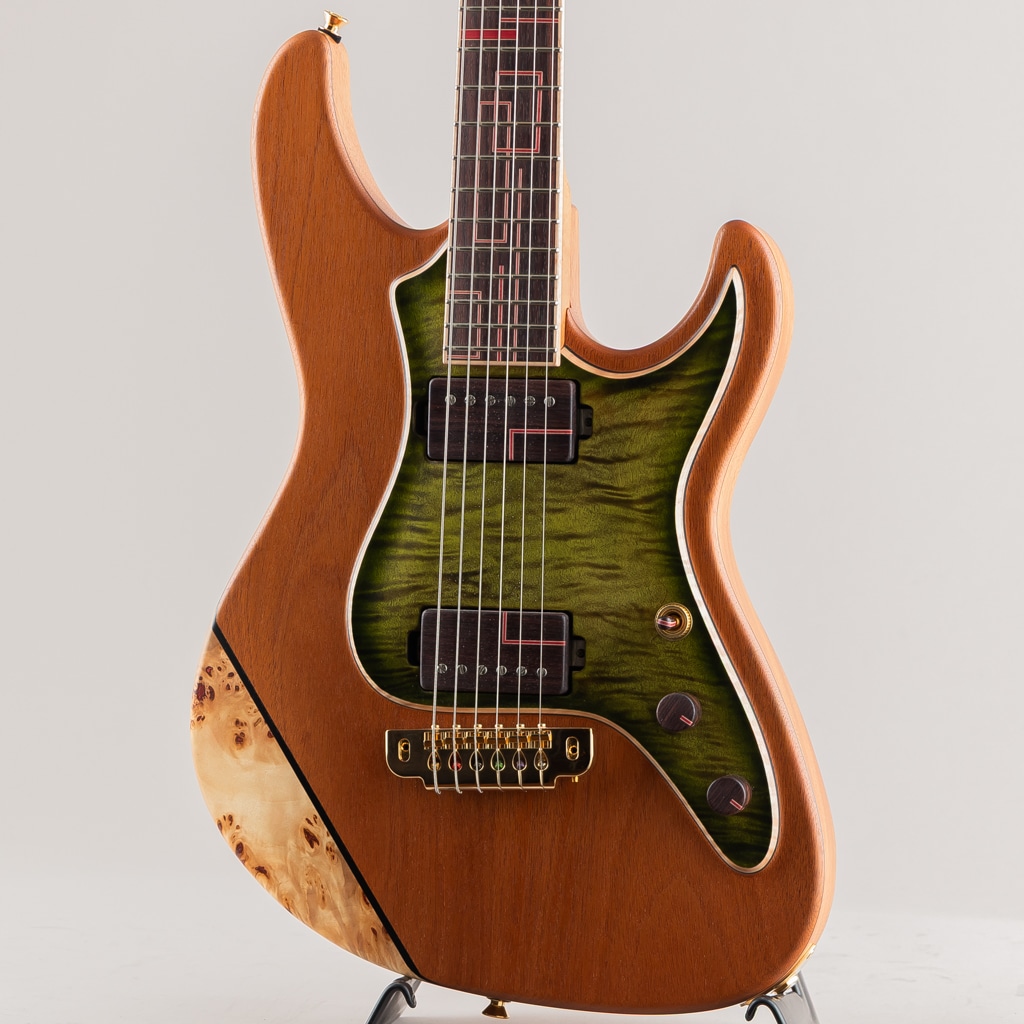 こちらはSTシェイプを基としたJASTERのショーモデル。鮮やかなローステッドバーズアイメイプルネック。ボディはホンジュラスマホガニーをトップ&バックでラミネートし、コンター部にバールポプラを採用。さらに美しいフィギュアドメイプルをピックガードと突板に見立て貼り合わせるという非常に個性あふれるデザインが唯一無二の存在感を発揮しております。緩やかにアーチのかかったトップのメイプルやピックアップカバー、バックプレートや各コントロールノブに至るまで細部にこだわりを感じられる1本です。