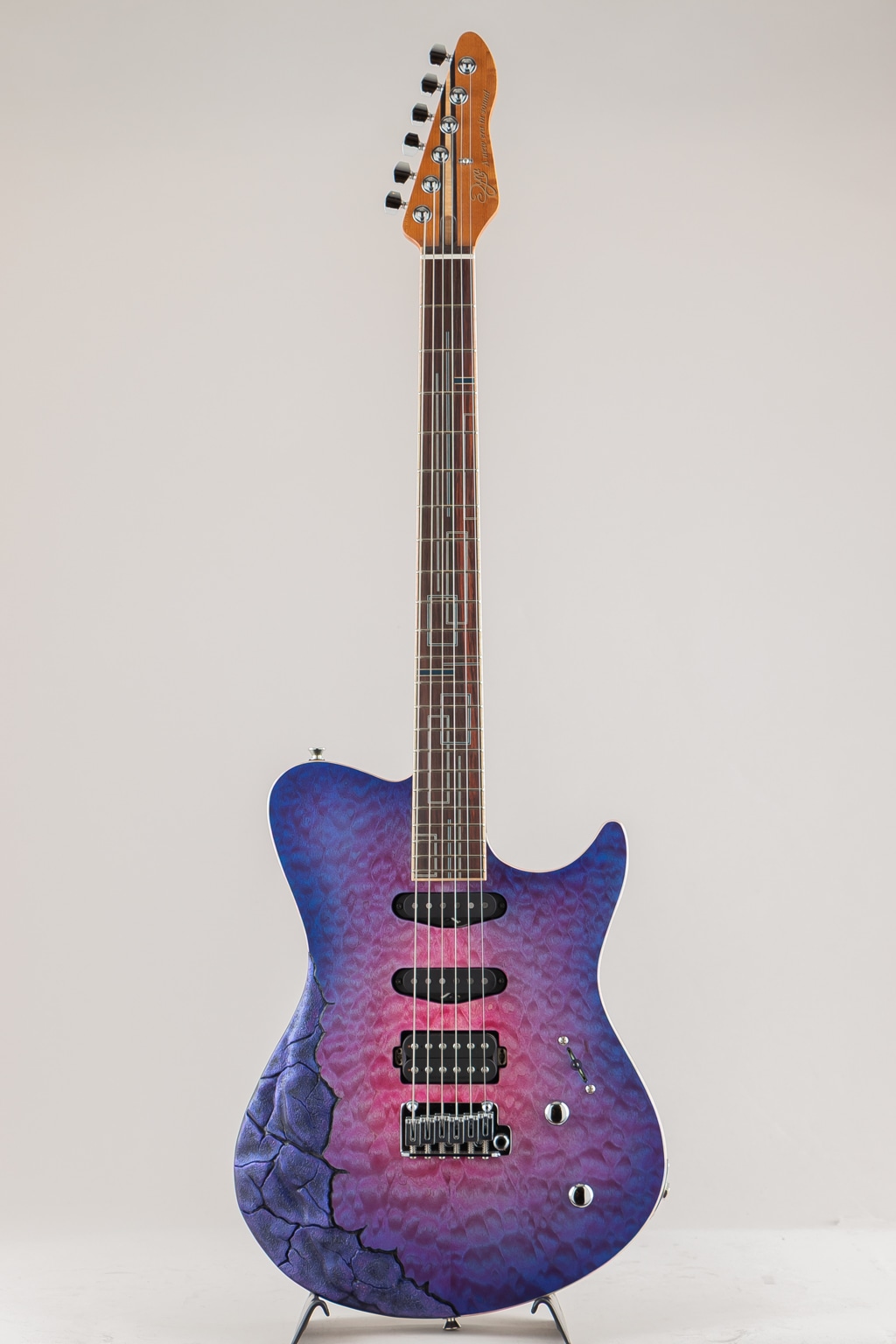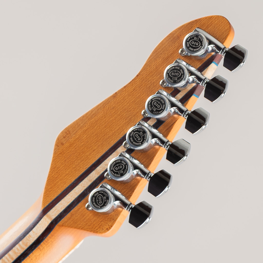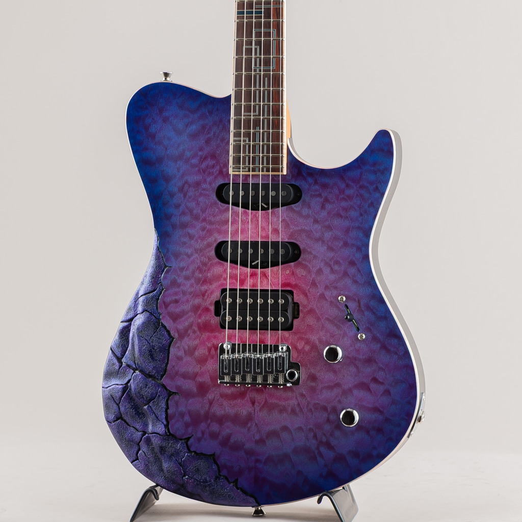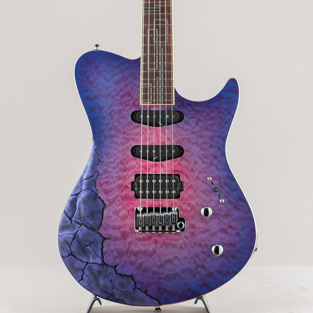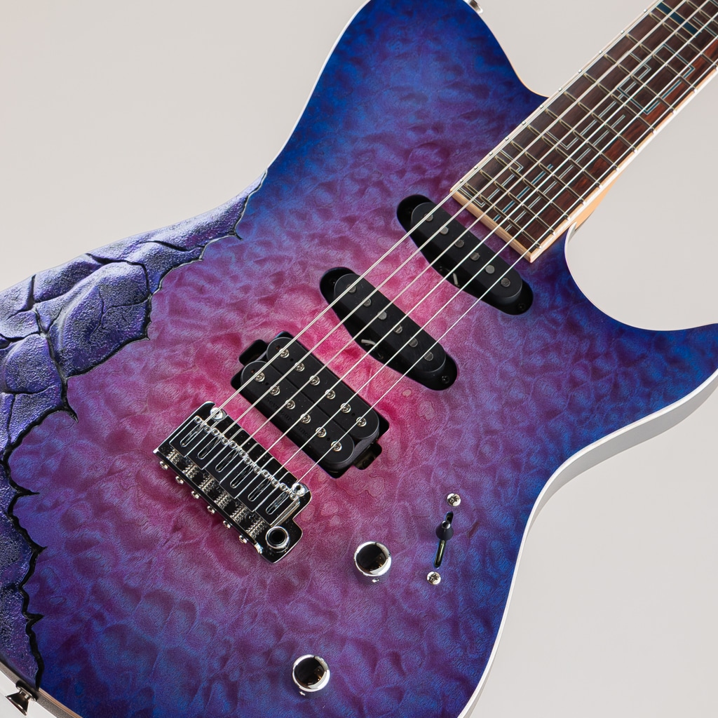 こちらはTLシェイプを基としたMOTIVEのショーモデル。杢の鮮やかなキルテッドメイプルトップのマホガニーボディ、フィギュアドメイプル&ローステッドメイプルネックといった希少かつ個性的な木材を惜しみなく使用しております。コンター部分はまるでトップ面から剥がれ落ちたかのようなリアルな質感が手作業で行われており、高い加工技術と相まって唯一無二の存在感を発揮しております。