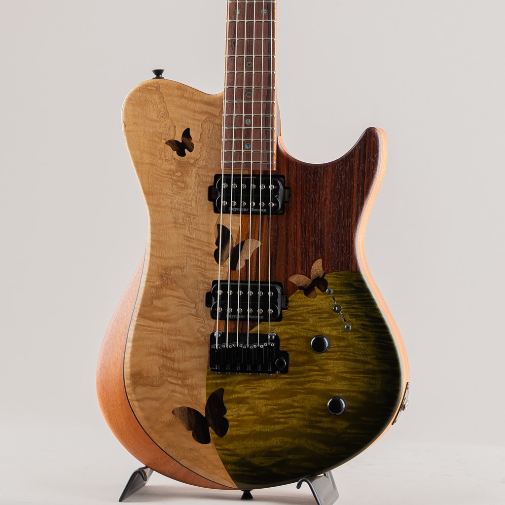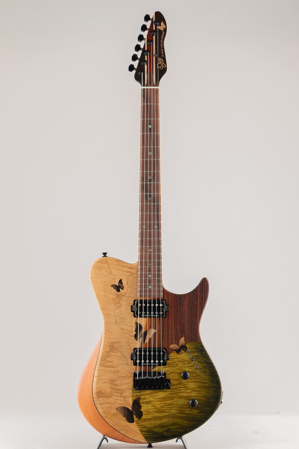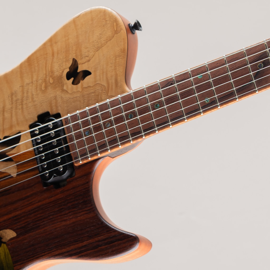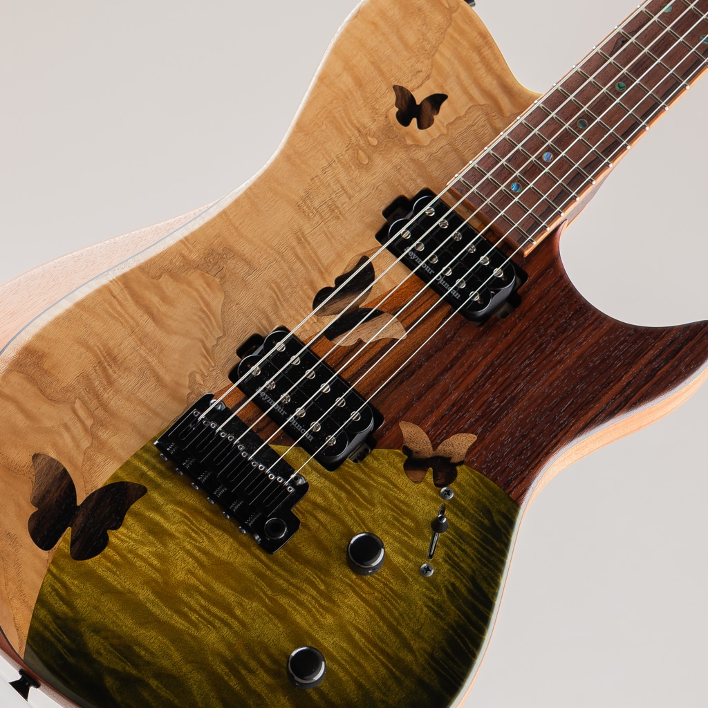 こちらはTLシェイプを基としたMOTIVEのショーモデル。ネックはパドゥーク/ウェンジ/メイプルを使用した強固な7pcネック。ボディはマホガニーをベースに、フィギュアドチェスナット/ローズウッド/フィギュアドメイプル/パーフェローで美しくラミネートされたデザインが唯一無二の存在感を発揮しております。滑らかな曲線のラインやボディとヘッドトップに埋め込まれた蝶等細かなポイントに職人の技を感じられます。