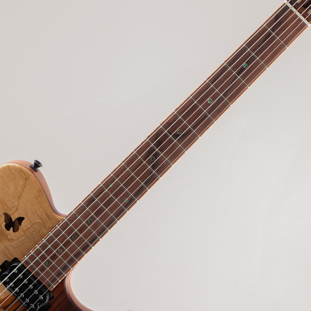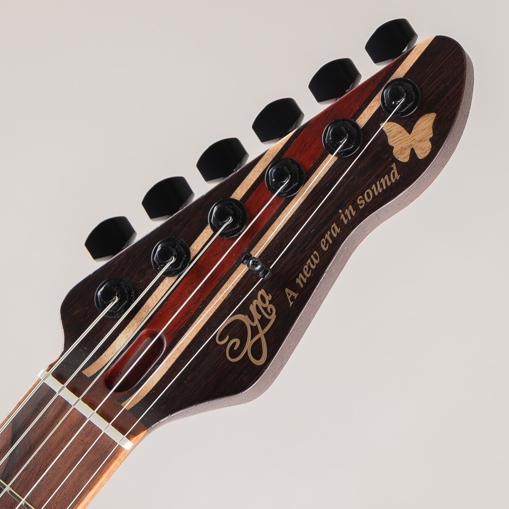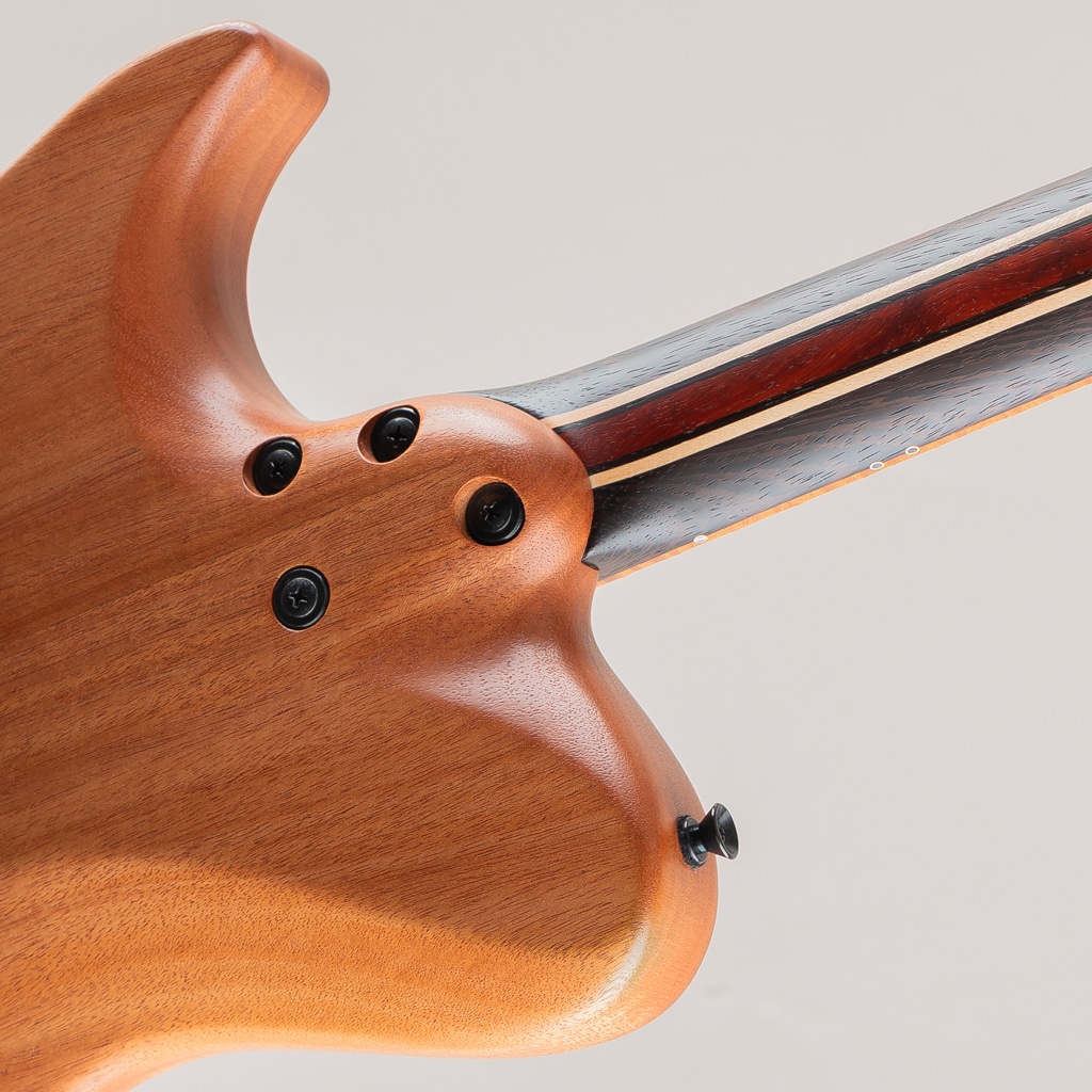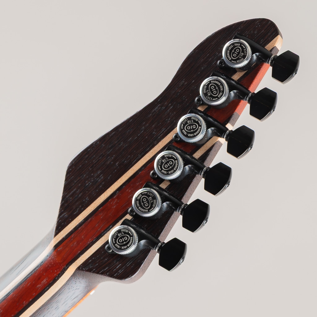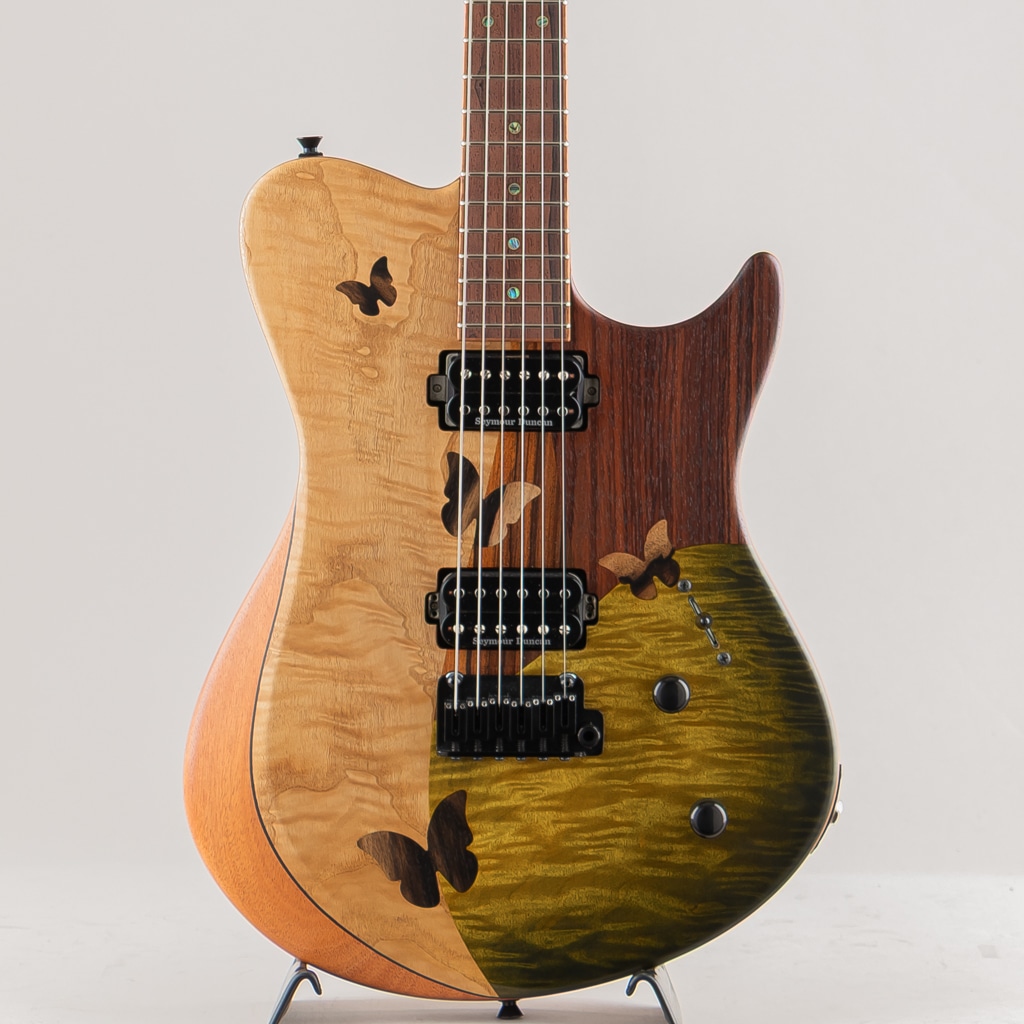 こちらはTLシェイプを基としたMOTIVEのショーモデル。ネックはパドゥーク/ウェンジ/メイプルを使用した強固な7pcネック。ボディはマホガニーをベースに、フィギュアドチェスナット/ローズウッド/フィギュアドメイプル/パーフェローで美しくラミネートされたデザインが唯一無二の存在感を発揮しております。滑らかな曲線のラインやボディとヘッドトップに埋め込まれた蝶等細かなポイントに職人の技を感じられます。