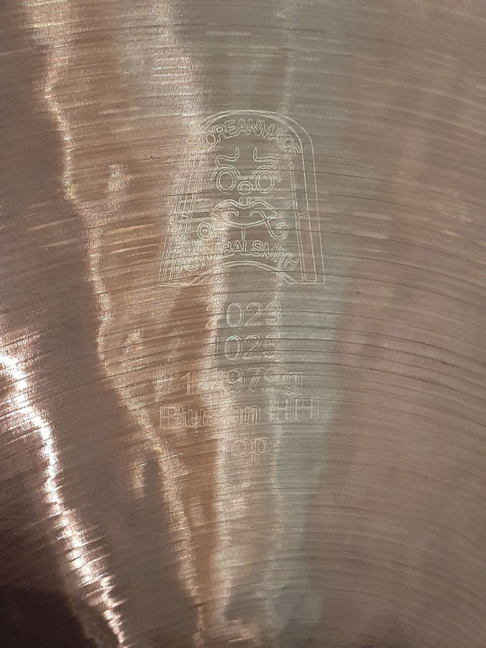 シンバル裏側にはブランドロゴ、製作年、シリアルナンバー、サイズ、ウェイト、品名の刻印がうっすら入っております。