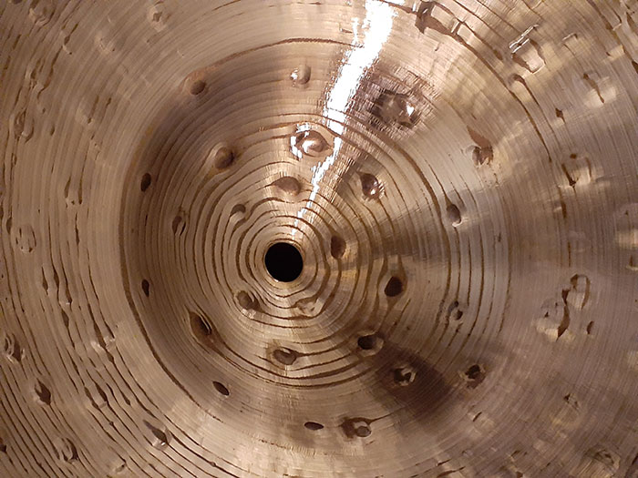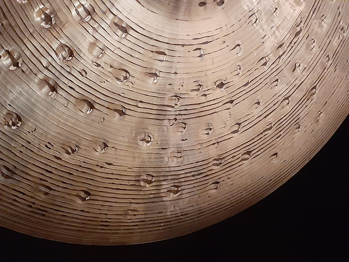 追加ハンマリングで表面にいくつもの深い窪みができ、このハンマリングと表裏全体に施したレイジング加工が相まって、クリアかつドライなスティックアタックと、それを包み支える豊かな低音を生み出しています。