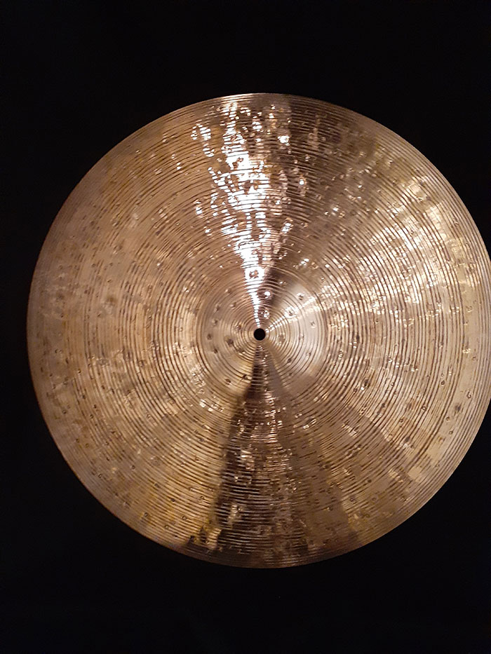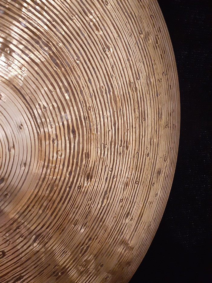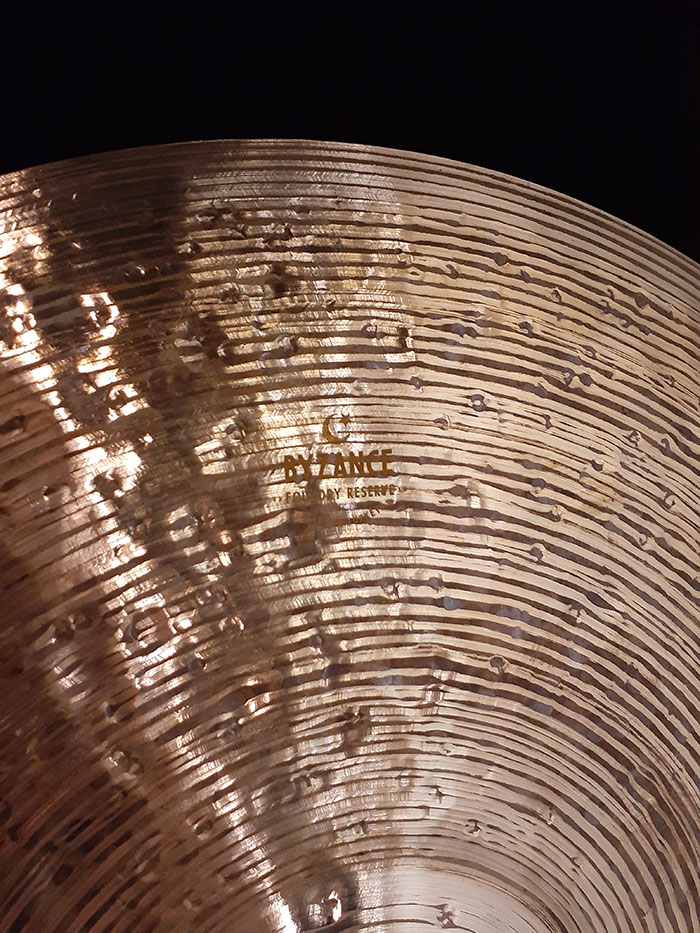 Byzance Foundry Reserve シリーズ・ライドは非常に多才なシンバルで、ドライなスティック・アタックの後に複雑な表情を持つ低くダークなウォッシュを特徴とします。初めに広範囲なハンドハンマリングによってロ―ピッチな土台を作り、その上でリッチな音色に仕上げました。全体に施したレイジング加工によって、スティック・ディフィニションにブライトなアタックを与え、後に続く豊かで低いウォッシュ音を実現しました。バンドをドライヴさせる力強いスティック音の輪郭がはっきりと分かるだけの十分な厚みがありつつも、同時に激しいクラッシュ音を轟かせるオープンさを損なわない絶妙なウエイトバランスにしています。