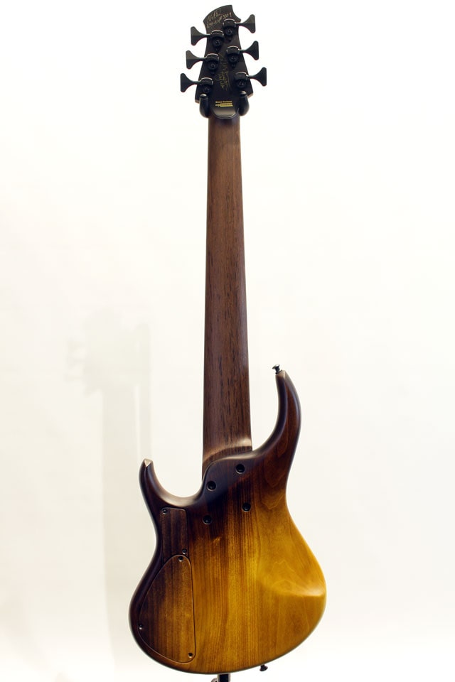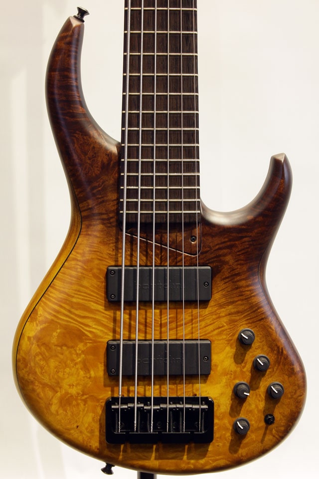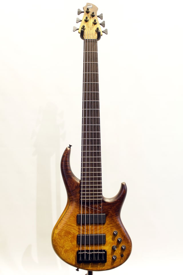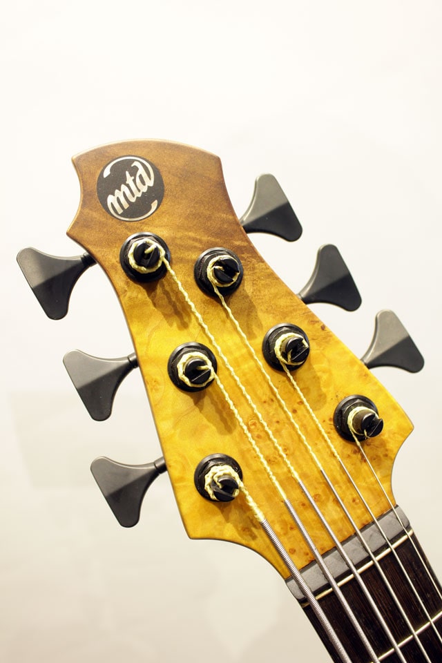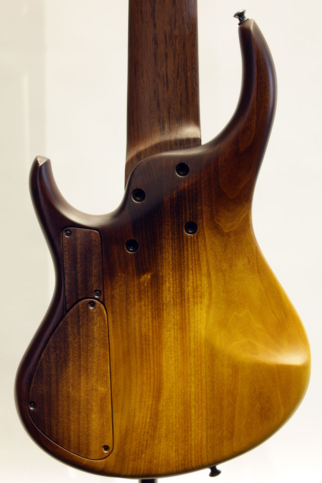 当機は、2020NAMMショウモデル。フェイドされたアースカラーが印象的で、バールメイプルの杢がその存在に大地を感じさせてくれます。そのバールメイプルはヘッド付き板、トラスロッドカバーにも採用され、ネック材指板材にはウェンジ、ボディバックにはチューリップウッド(ポプラ)を配した仕様となっております。ボディのチューリップウッドは、軽やかかつ温かな音響を持ち合わせ、ウェンジネックがそこに濃密な低音の粘りをもたらします。全体バランスとして、程よいコンプ感と程よいパンチを特徴とする当機。MTDらしさを存分に感じていただく事が可能です。また、オリジナルのバルトリーニピックアップとサーキットがMTDの持つアコースティックニュアンスを最大限に引き出しております。