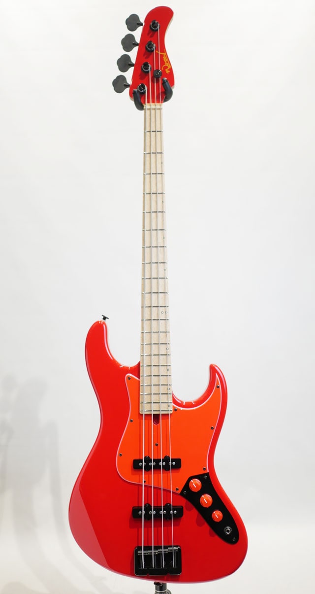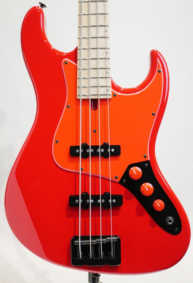 2ピースのアルダーボディにバーズアイメイプル指板、メイプルネックを組み合わせた当機。アルダーメイプルのベースはよく抜けないと言われがちですが、搭載されているKariya Pickupのエッジの立った倍音が特徴的な高音域と、重心の低いボトムの恩恵により、そういったネガティブな印象は全くなく、扱いやすい自然なサウンドに仕上がっています。アルダーボディらしい芳醇なミドルにメイプル指板の明快で甘く抜けるアタック感が心地良く、ジャンルを選ばず使用できる汎用性の高さを感じさせます。