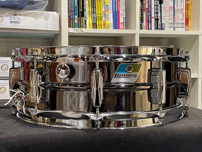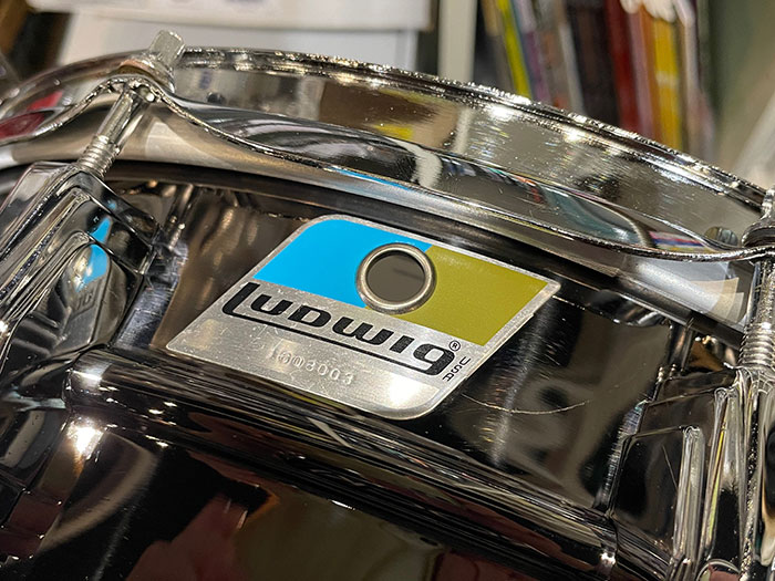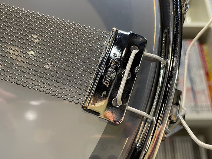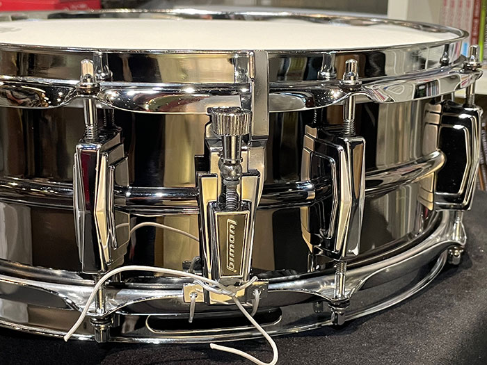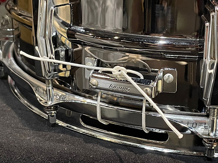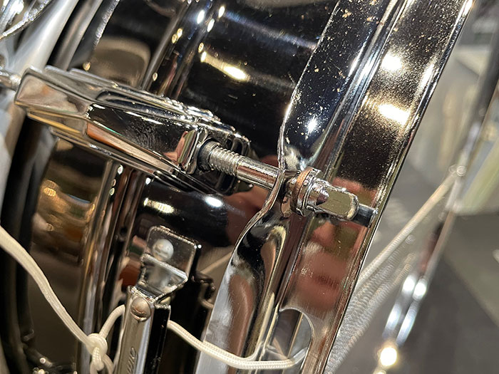 トップ・ボトムフープ、ストレイナースイッチ、バット、内蔵ミュート、ラグ、テンションボルト、スナッピーワイヤー全てオリジナルパーツを装着しています。所々ブラックニッケルが剥がれてくすんでいます。良い個体で音量がありイエローブラス特有のウッドサウンドのようなのが特徴です。