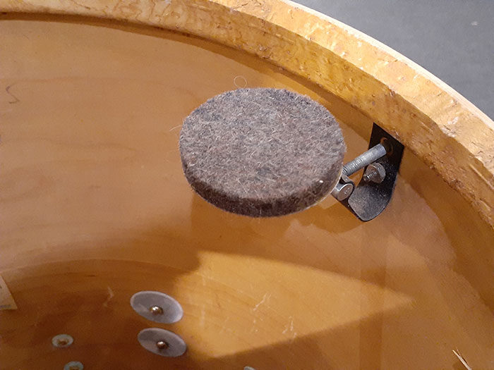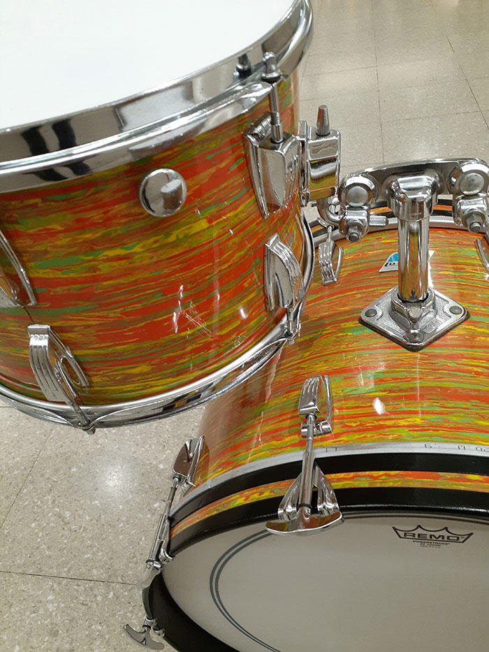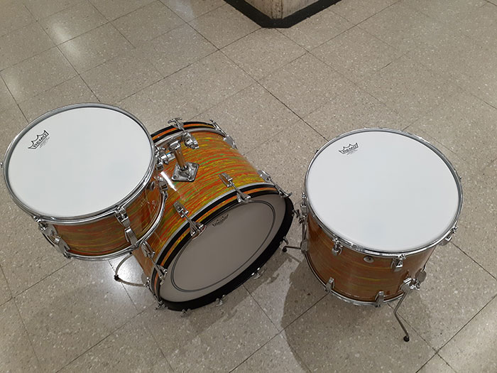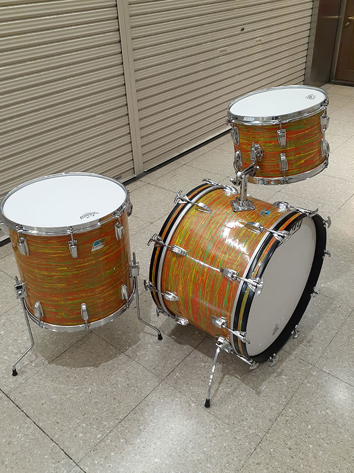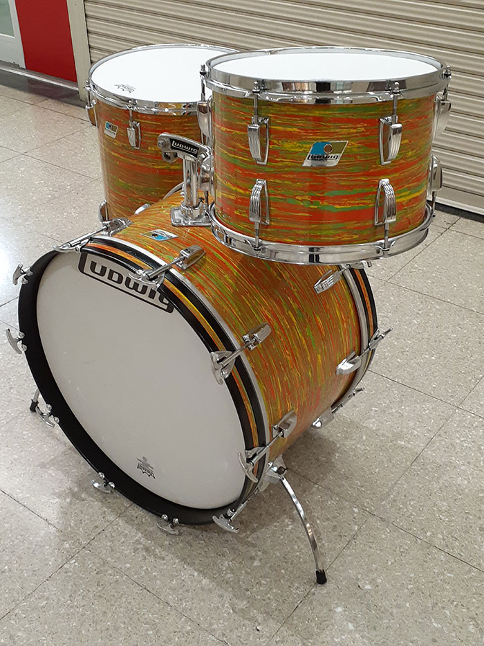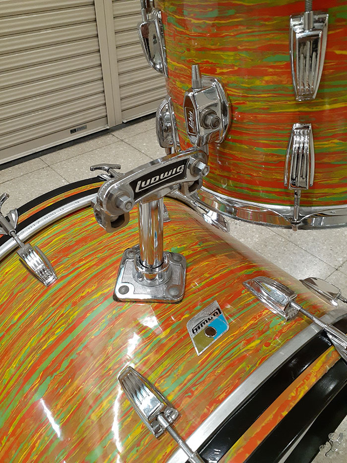 バスドラムヘッド/フロント:レモコーテッドアンバサダー(70s Ludwigロゴ入り)、打面:レモ P3コーテッド