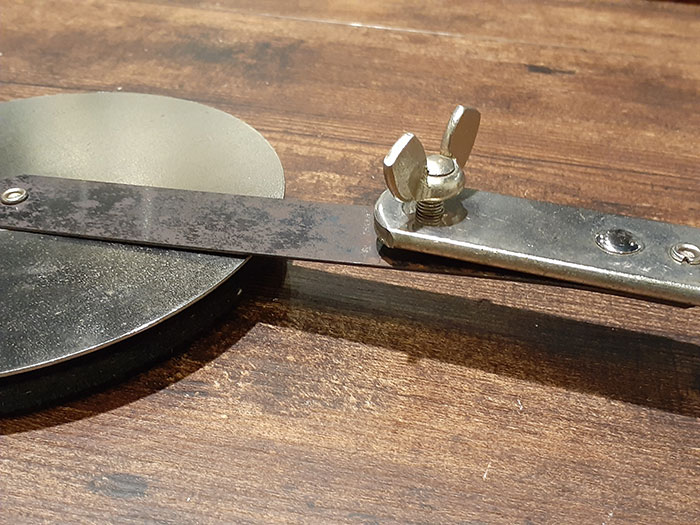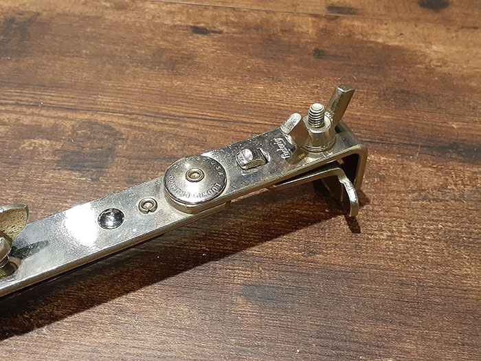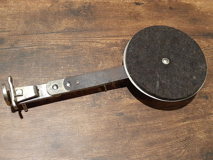 中央部の蝶ネジを回転させて当たり具合を調整可能です。大きな円形のフェルトが装着しており。フロント側もしくは打面側からも
