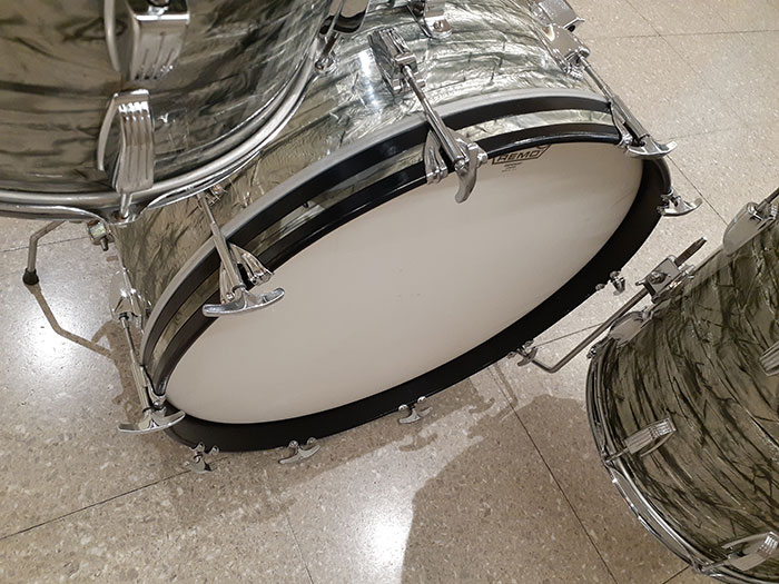 バスドラムヘッド/フロント:スムースホワイトヘッド(60s Ludwigロゴ入り,シルバーホールカットリング装着)、