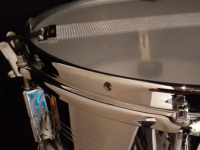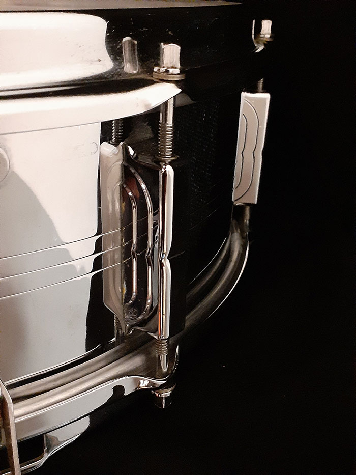 こちらのフープはスティックを守るというよりも、内側にフランジした部分よりも、ヘッドの枠を押さえる部分の水平さとロッド穴部分の作りがサウンドに大きく関係しているように思え、プレスフープとダイキャストフープの中間のようなイメージです。