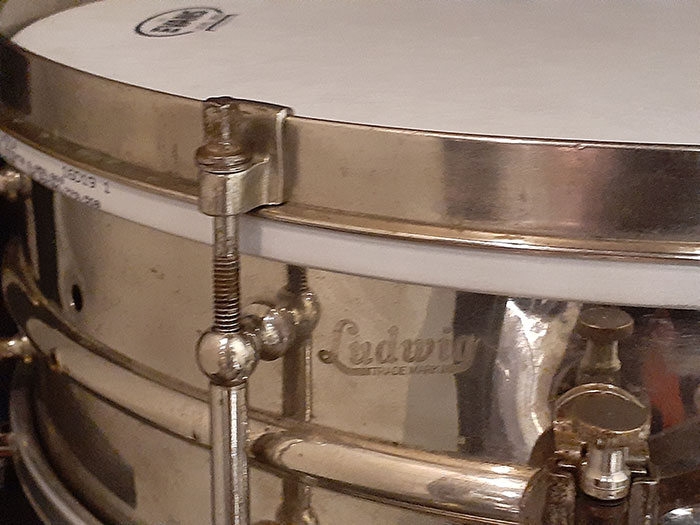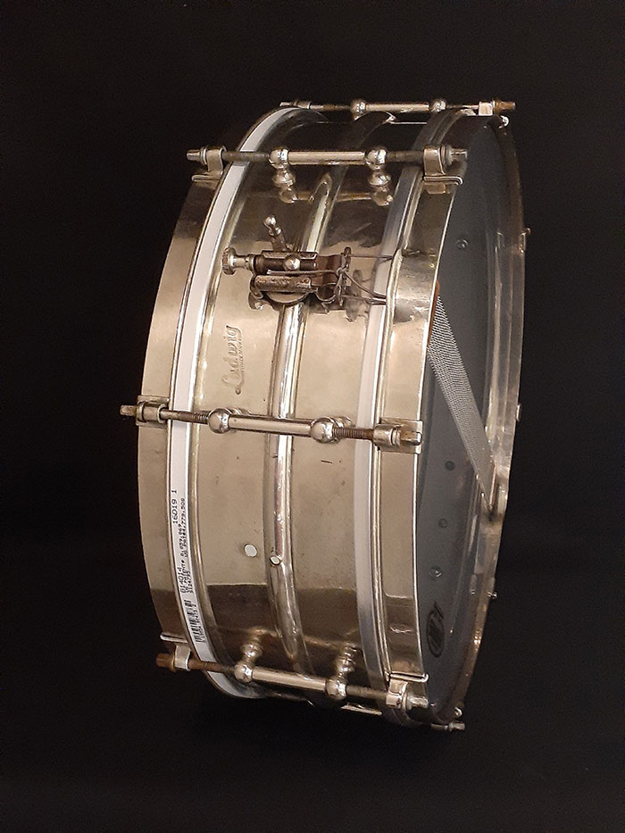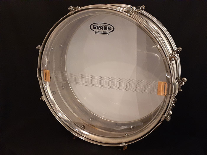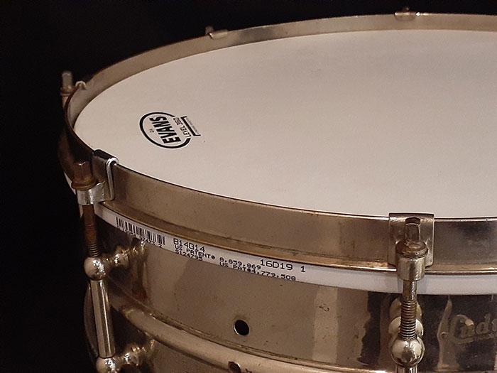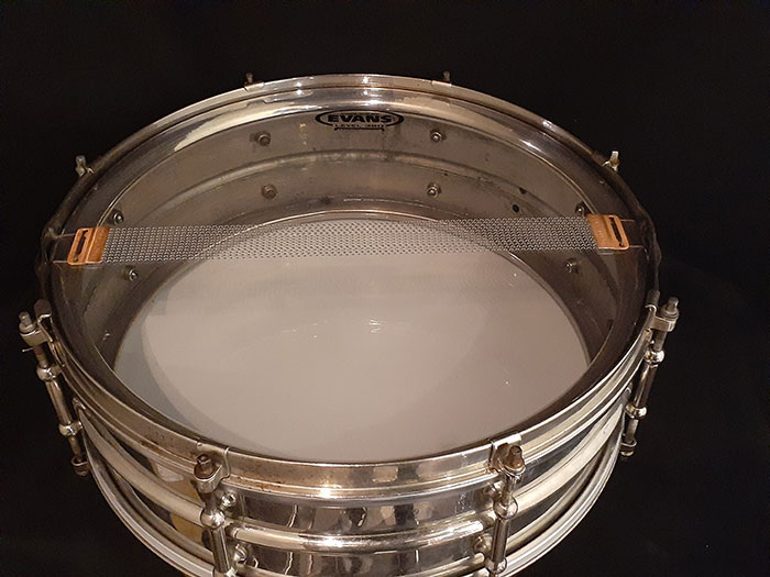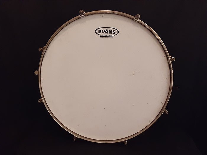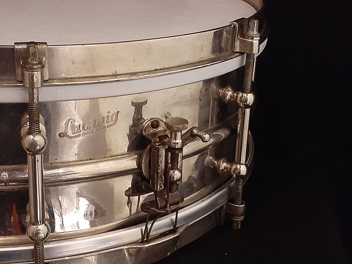 シングルフランジのオープンな倍音でロールしてもよし、ゴーストノートもよく拾うオイシイ音が出ます。また10テンションに比べて、8テンションスネアはビンテージらしい倍音が得られサステインも長くなります。そのサウンドに代表される様に、この年代とは思えない程の、細かいゴーストノート、ハイピッチにした時でも嫌みのない、乾いた抜けの良いスネアサウンドが特徴です。現在のブラスよりも温かみがあり、どのジャンルでも対応できるモデルです。ヘッド&スナッピーワイヤー以外はすべてオリジナルパーツで問題なく使用できます。
