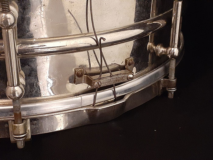 約100年ほど前のスネアドラムですが、致命的なヘコみやキズはなく状態良好の個体です。