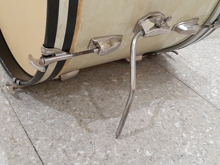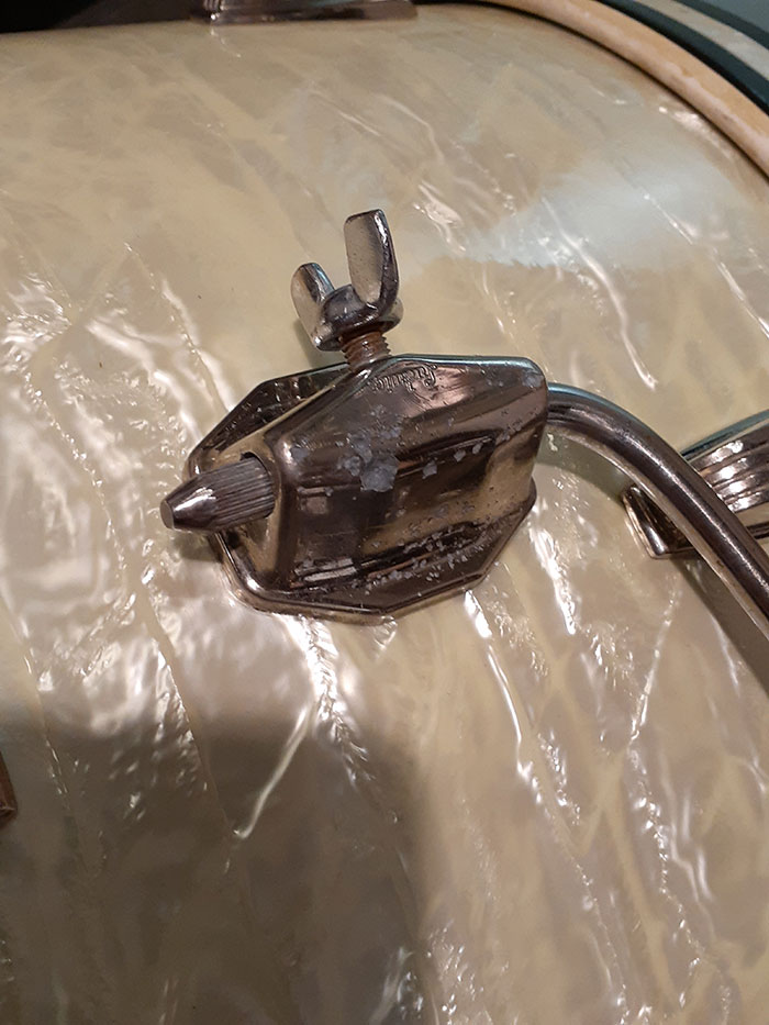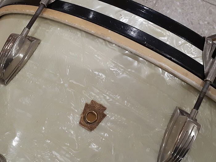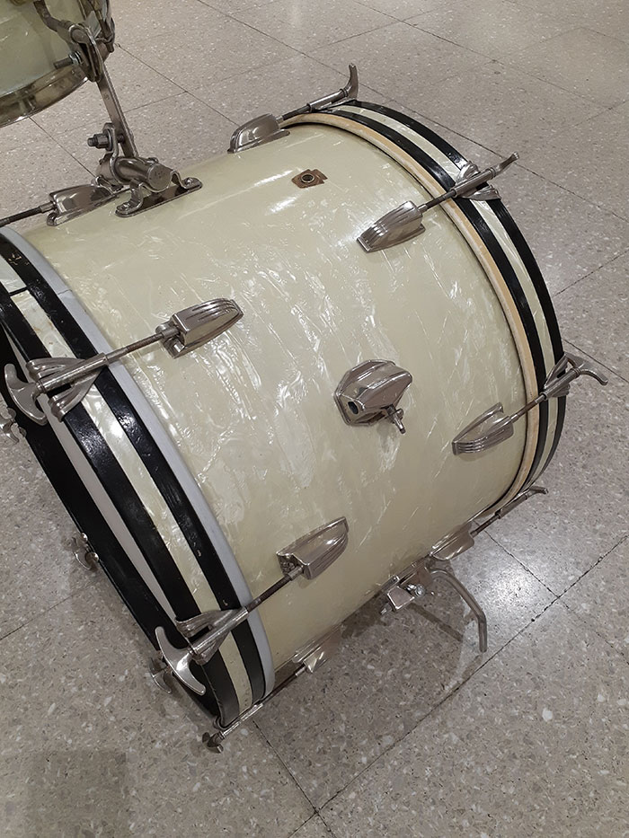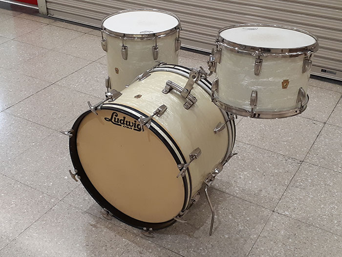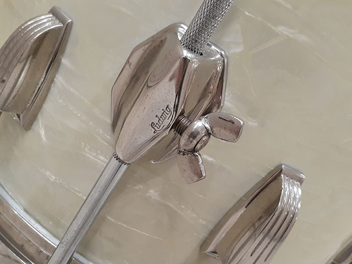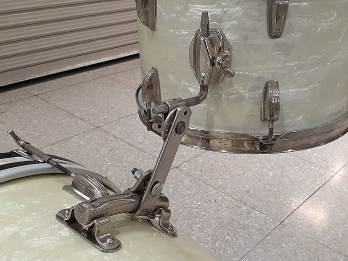この頃の仕様はまずパーツ類がニッケル仕様、インナーマフラーがRED MUFFLERが装着、レッグブラケットなど筆記体ロゴLUDWIGが特徴です。