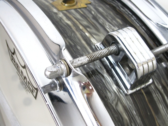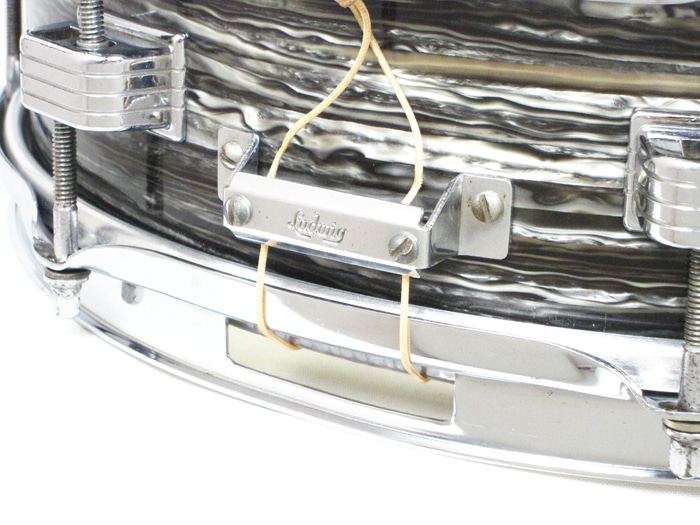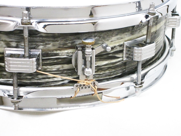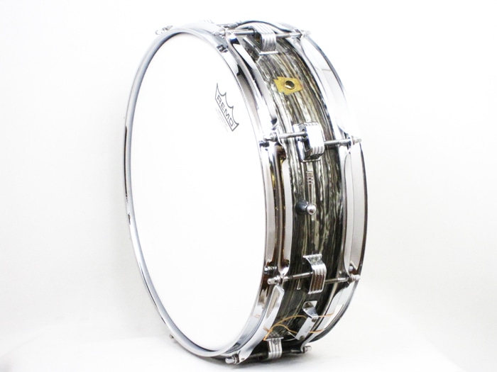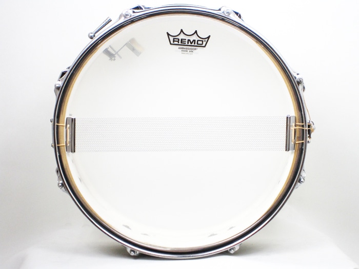 カバリングに若干のキズがございますが問題ございません。張合わせ部も浮く事無くキレイな状態で残っています。 トップフープはブラスフープ装着、ボトムはスティール製、ストレイナースイッチ(P-84)、バット部(P-32)、スネアワイヤーは現行のL-1930(20本ワイヤー)が装着しております。ヘッドはREMOのコーテッドアンバサダーとスネアサイドアンバサダー装着。