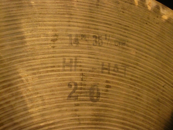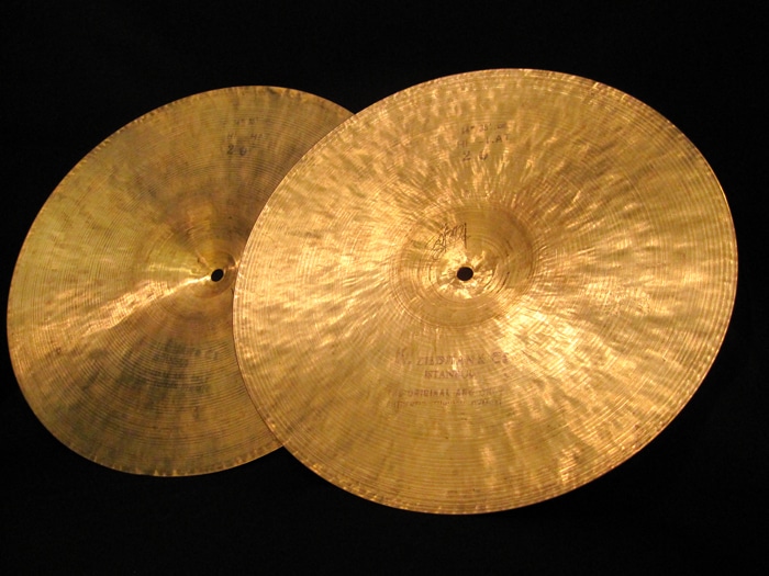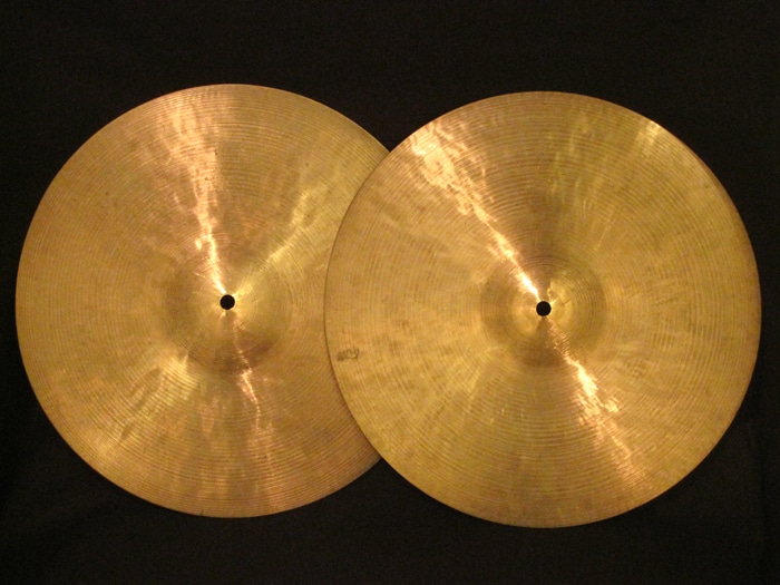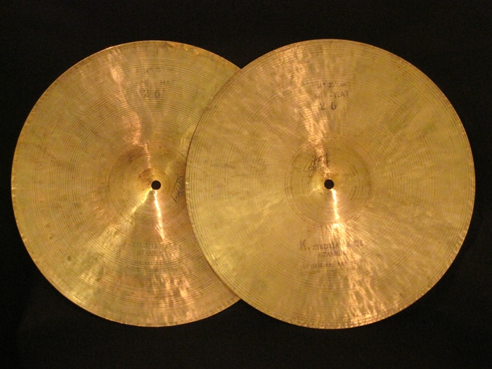 独特な低音感とトラッシーさが特徴、ハーフオープンで刻んでも、レガート、クローズ音でも色気と上品さが目立ちます。シンバル裏側には「K.ZILDJIAN&Co ISTANBUL THE ORIGINAL AND ONLY AUTHENTIC TURKISH CYMBAL」と「14" 35 1/2cm HI-HAT 20」スタンプが押され消えずに残って非常に珍しい状態です。また製作者サインもされています。ウェイトは761g/858gのライトウェイトとなっています。