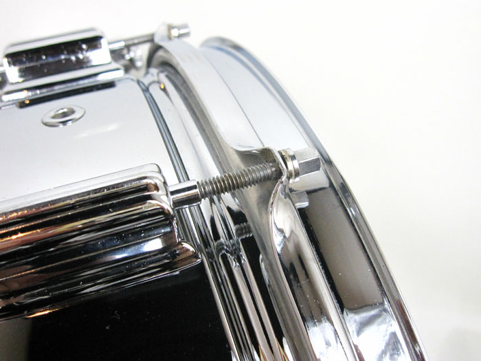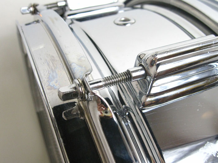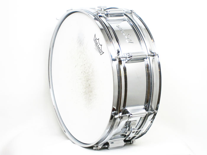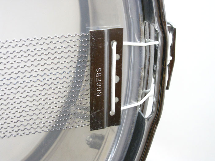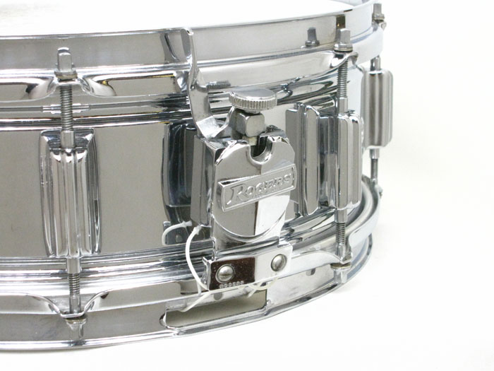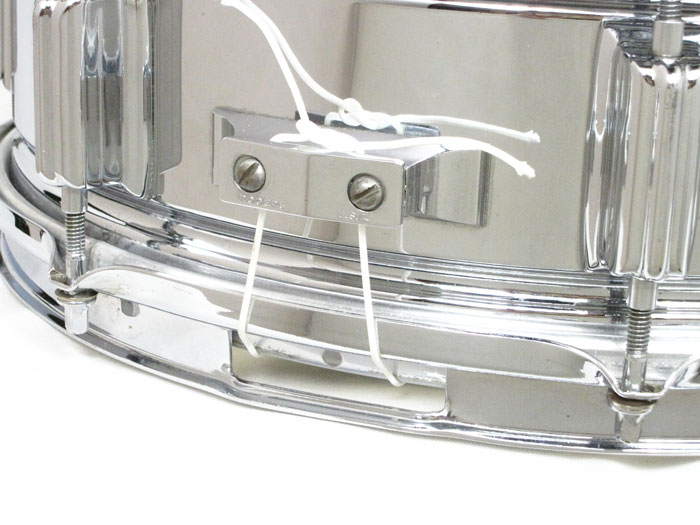 シェルの状態は良好で錆や若干のキズや打痕はあるもののエッジの破損や、目立った傷やメッキ剥がれも無く奇麗な状態で残っています。フープ、ラグ(ビーバーテールラグ)、ストレイナー(SWIV-O-MATIC)はオリジナルパーツが装着、ボトム側のテンションボルトは他社製に交換されています。トップヘッドはコーテッドアンバサダー、ボトムヘッドは現行スネアサイドアンバサダーに交換。スナッピーはオリジナルRogersワイヤー20本仕様が装着でオリジナル性の高いアイテムとなっております。