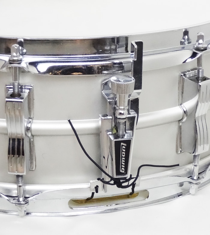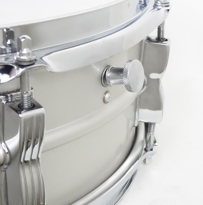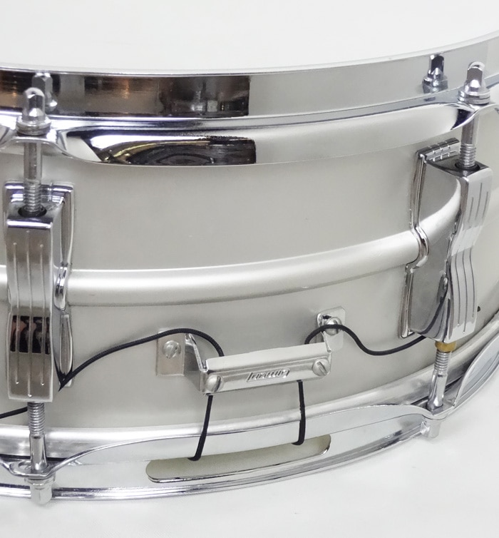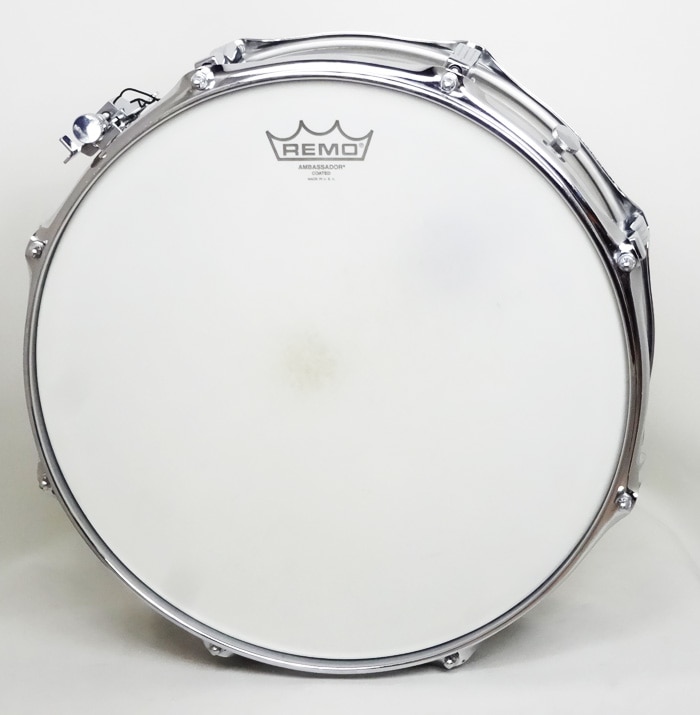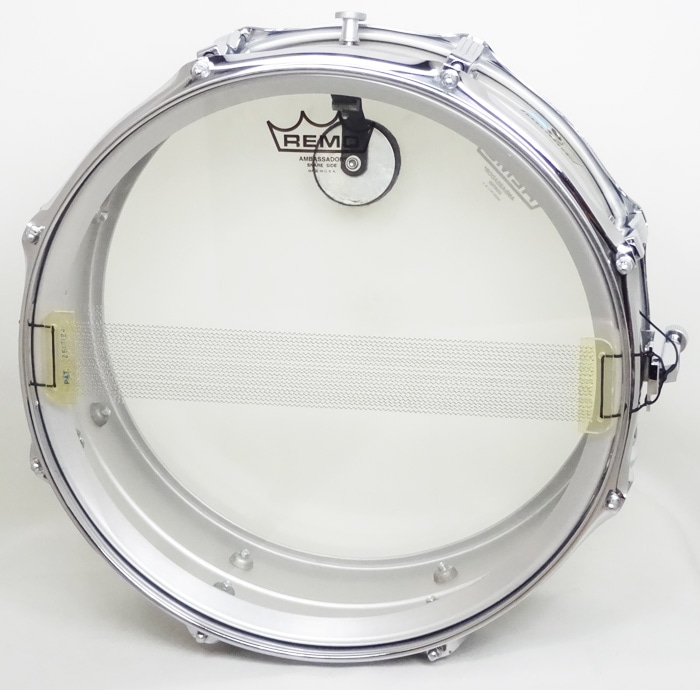 ストレイナースイッチは70'S BLACK FACEのP-85(2穴タイプ)、70sプレスフープ、内蔵マフラー、バット部はP-32、スナッピーは60年代製造のプラスティックエンドプレートワイヤー(20本)が装着されています。トップ、ボトムヘッド共にREMO製に交換しています。