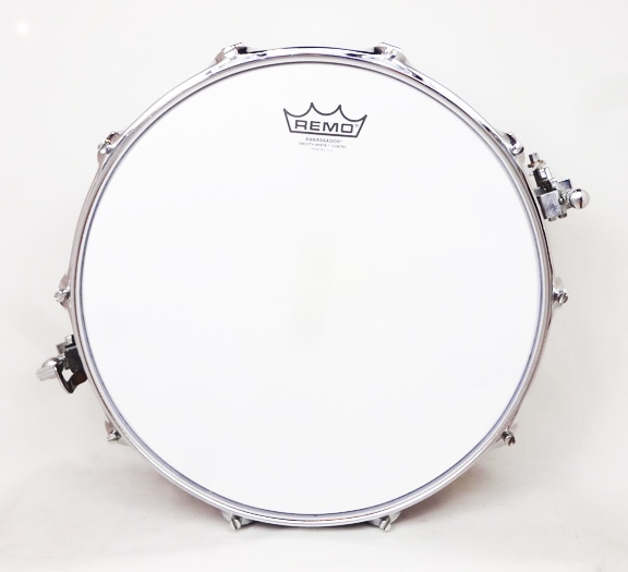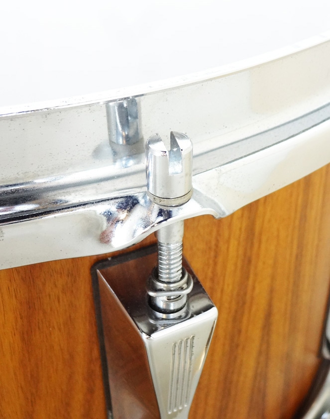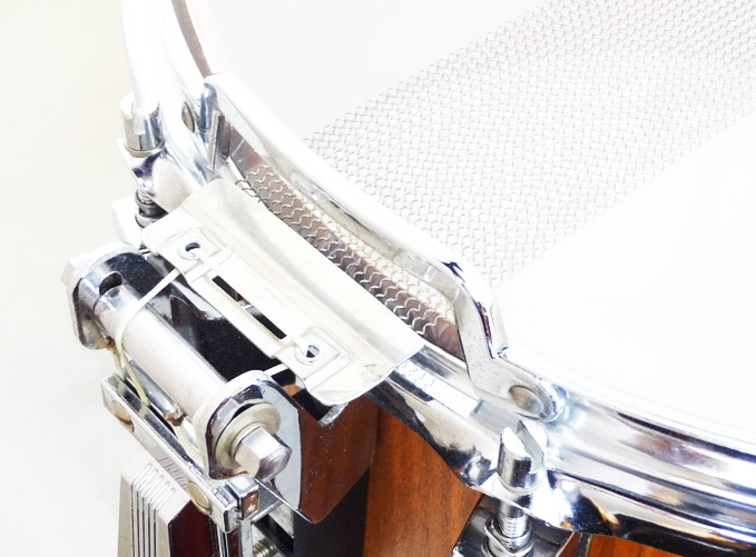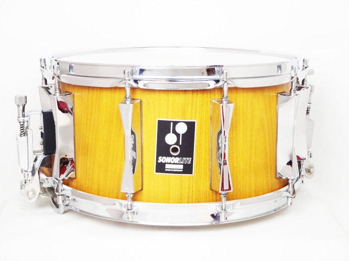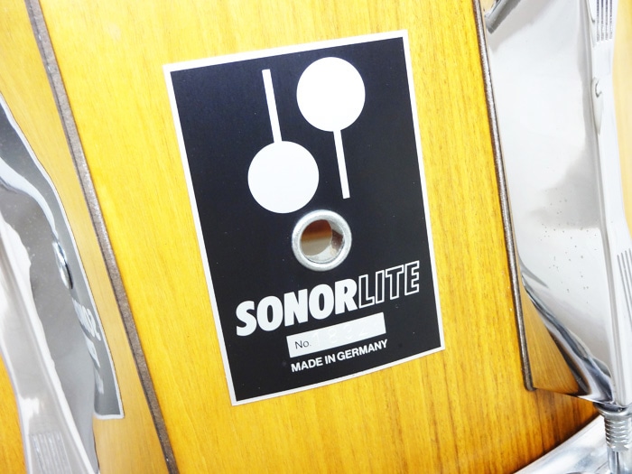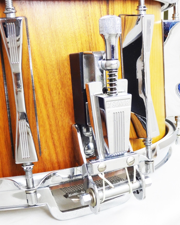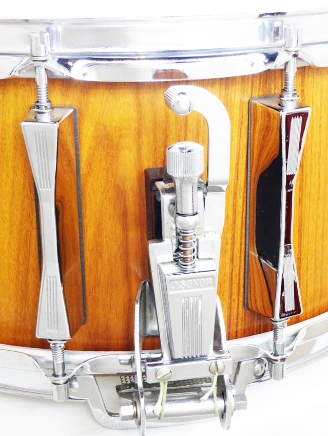 ソナーライトシリーズは1983年頃より発売開始し、86年にLD547x(スローオフII)タイプを発表、当初フープはトリプルフランジでその後90年代に入るとダイキャストフープに変更、10ラグと12ラグ仕様を選択できました。 7mm12プライとソナーラインナップの中では薄めで重量も比較的軽いスネアです。 フープはオリジナルの10テンショントリプルフランジフープが付いています。スナッピーワイヤーはフェローマンガンスティールワイヤー24本全面当たりが装着。ストレイナー、バット部はどちらからでもワイヤー調節のできるスローオフIIとなっています。 チューニングボルトはSONOR伝統のマイナスボルトです。チューニングキーも付属します。 化粧板はカタログ外カラーのローズウッドで非常に珍しい特注仕様となっています。