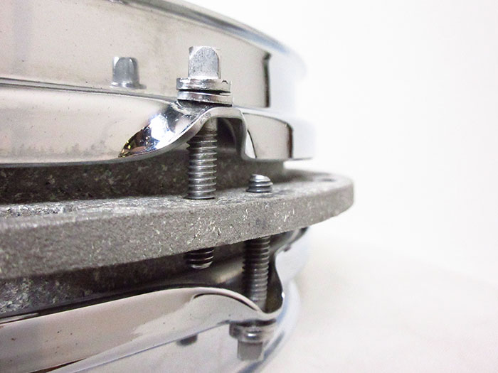 6。ラグの代わりに、テンションロッドがフランジ・シェルに直接絞められる構造。これによって見た目でもチューニング確認が可能。