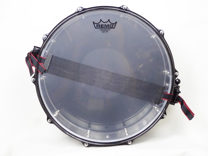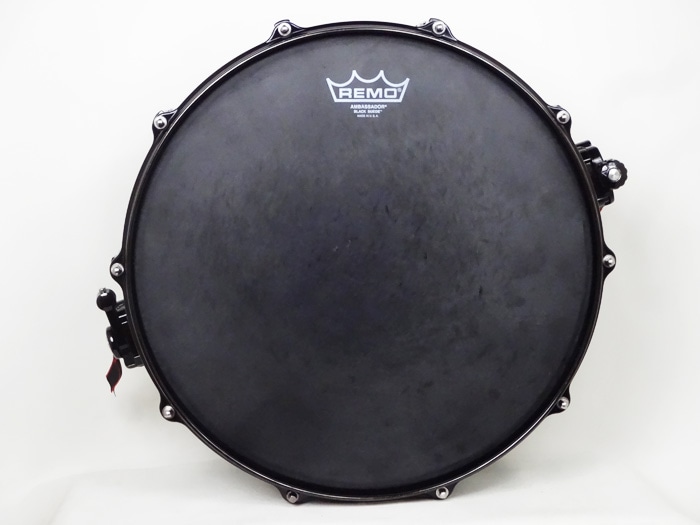 ラグやフープ、ストレイナーは純正のブラックパーツを装着。さらにヘッドもBKLACK SUEDE AMBASADOR,