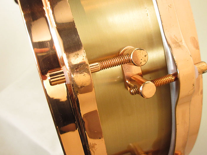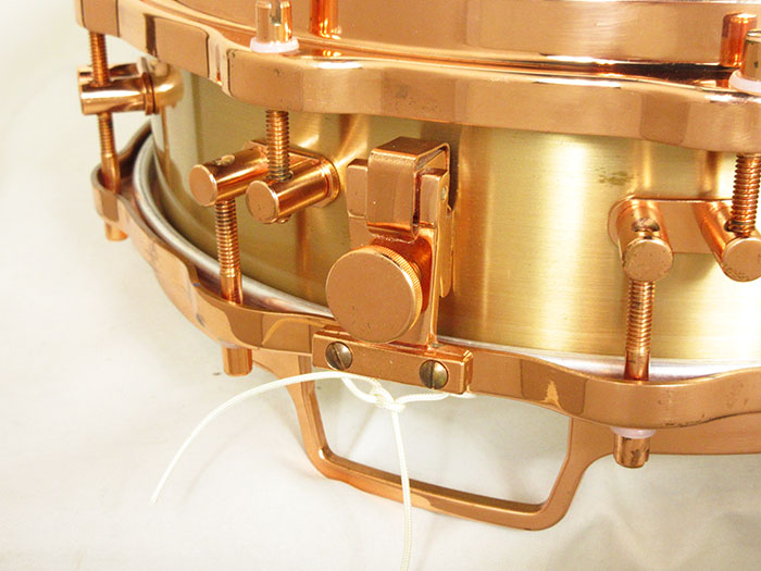 ブロンズを鋳造してから削り出す製法で、エッジの部分の厚さは5mmと分厚く重量は約7キロほどあります。スネアスタンドはなるべくヘヴィウェイトでギア式をお勧め致します。全体的に細かなキズやコパーメッキにシミや、ボトムフープにはくすみなどありますが、基本的にかなり美品でございます!!サウンドに影響するようなシェルの歪みやヘコミは無く現状使用に問題ございません。