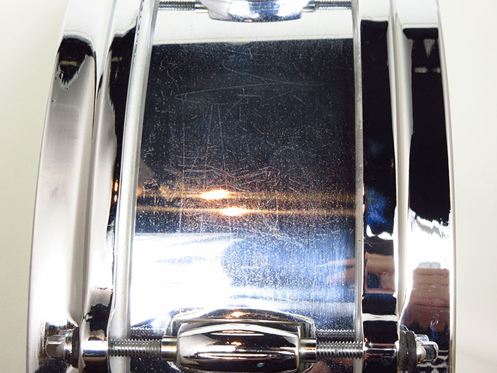 グレッチオリジナルワンピースラグとマイクロマティックストレイナー仕様、カバリングはクロームニトロンで1971年のみ生産されたレアカラーです。大きなダメージはございません。シェルエッジも上下とも奇麗に整っておりオリジナル加工のまま残っています。インナーにはシルバーインテリア塗装仕上げ、オレンジラベルには「4175」の型番とシリアルナンバー記載されて当時の風格を保っています。ラグやフープ、ストレイナー、バットにはビッツが出ています。