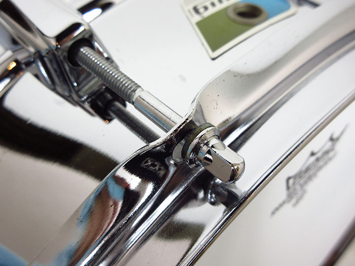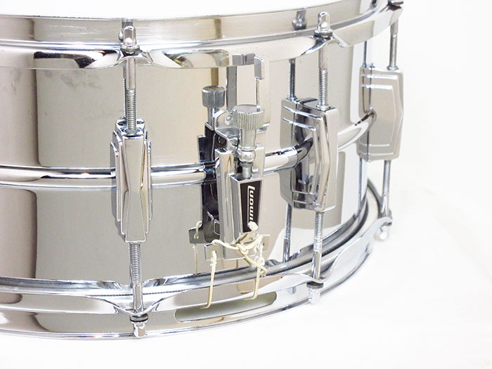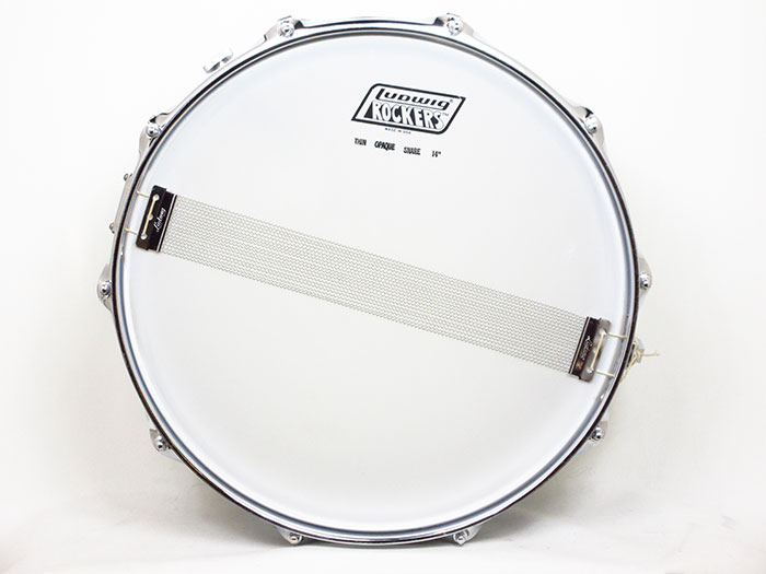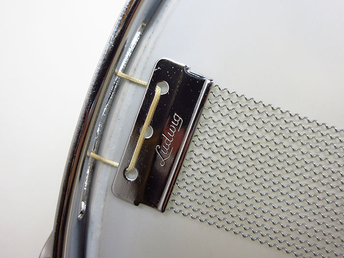 バット部は70S P-32を搭載し止めネジも生きています。スナッピーワイヤーもオリジナル1930 18本を装着、トップヘッドはREMOコーテッドアンバサダー、ボトムヘッドはLudwig オリジナルヘッドを装着しております。Ludwigスネアの中で重要な役割をするテンションボルトワッシャーはブラス製のオリジナルで高音域の倍音成分を緩和します。
