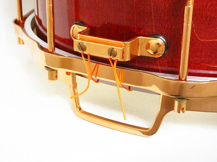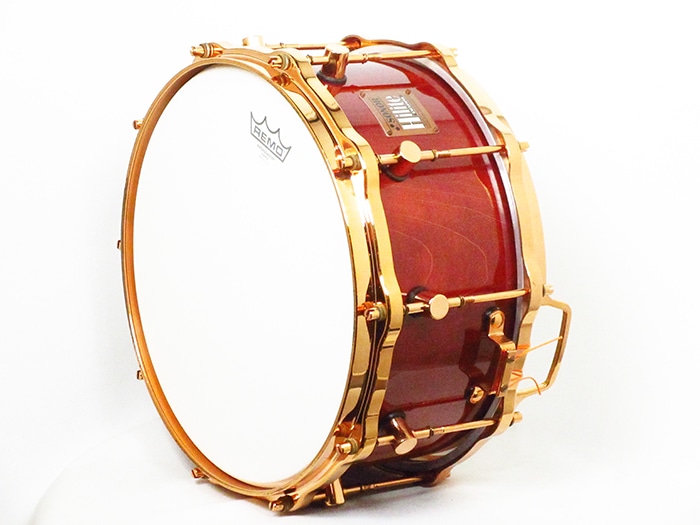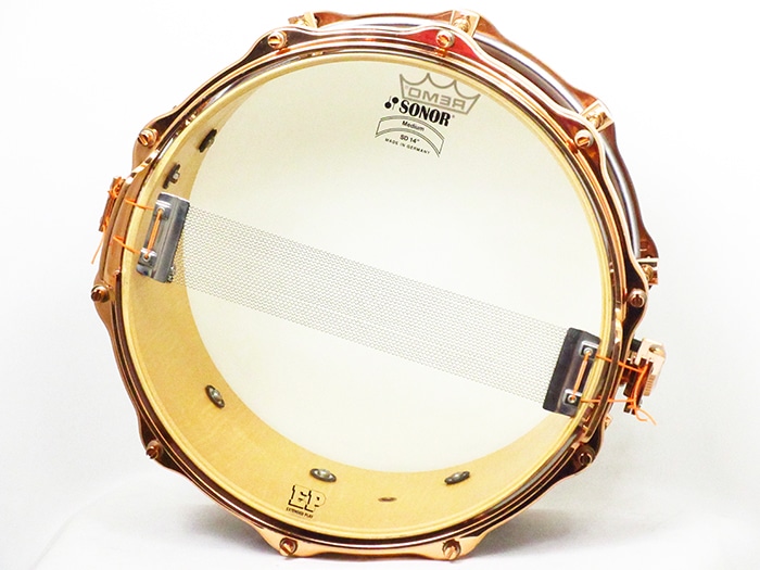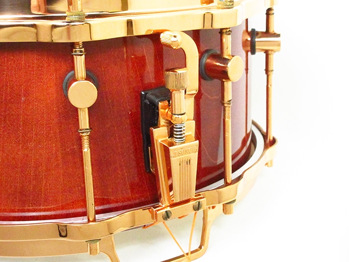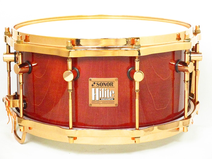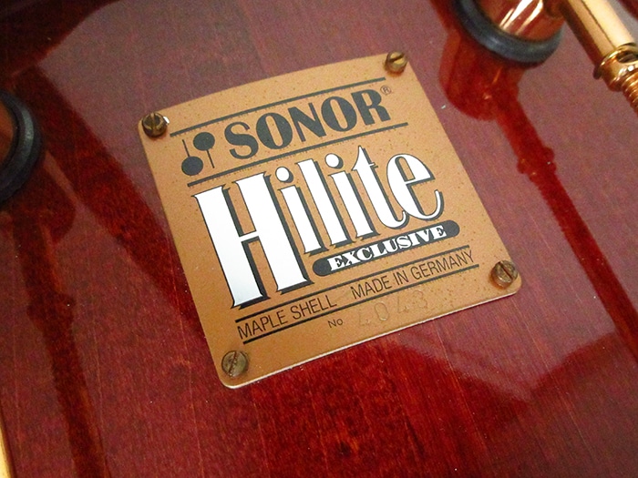 初めてメイプル材を使用したHiliteシリーズで、SONOR次世代を担う新しいモデルとなっておりました。初のメイプルといってもさすがSONOR社のハイクオリティサウンドであり、異常な程の威圧感に圧倒されます。メイプルの良い所は保ちつつ、SONOR独特な音量と抜けやバーチの様な粘りもありサウンドに貫禄がございます。この時代のメイプルは北米ではなくヨーロピアンメイプルを使用しておりフープはコパープレートのダイキャストが搭載、90年代以降に生産されたものになります。またワンポイントのチューブラグとボトムを支える異様に長いハイテンションボルトが印象的でございます。