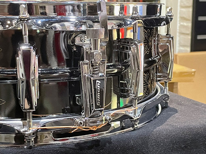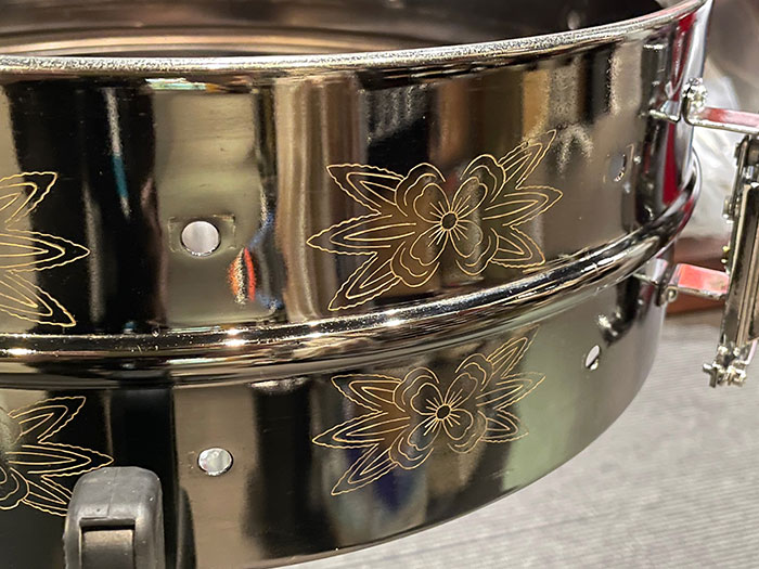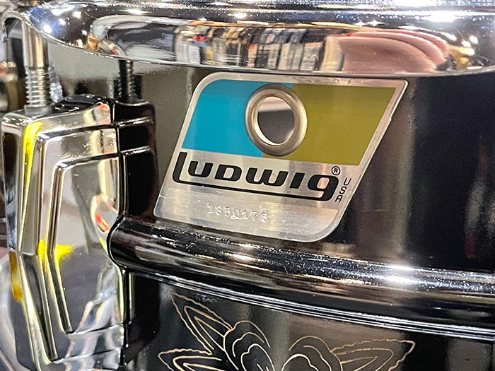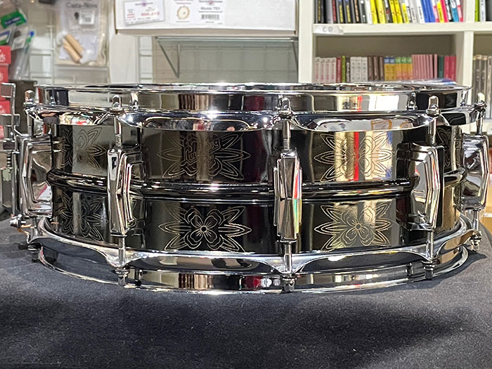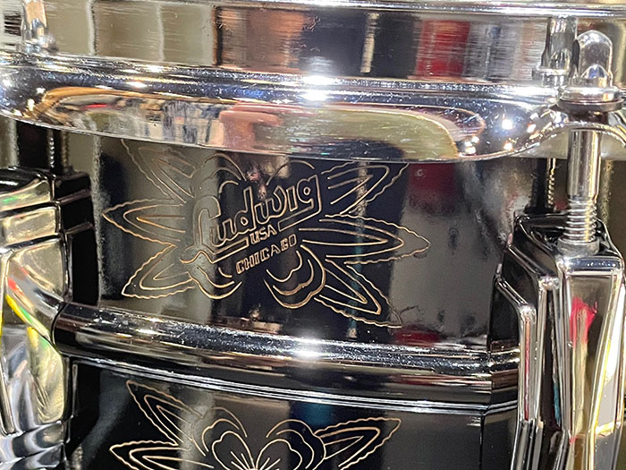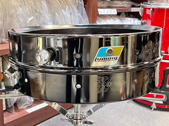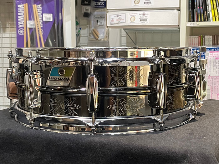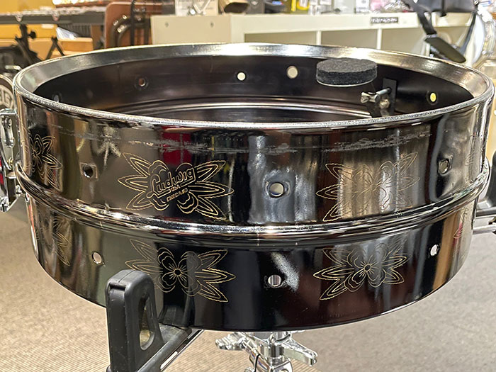 In addition to the head, the top and bottom hoops, strainer switch, butt, built-in mute, lugs, tension bolts, tension bolt washers are all made of brass, and snappy wires are all original parts. Sculptures were produced from 1979 to 1981, existed in two patterns, called six leaf four petal, and were immediately discontinued by the new owner, Selmer, as they were expensive and unprofitable. Therefore, it is treated as a very rare and rare item.